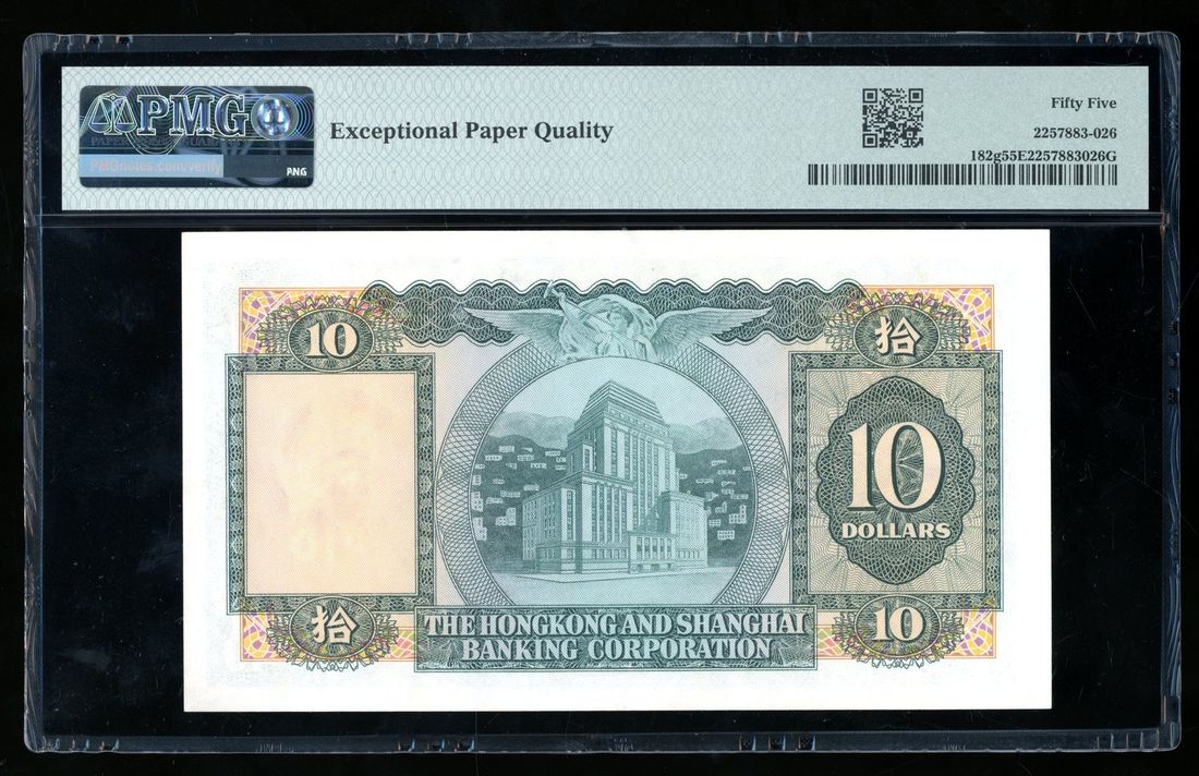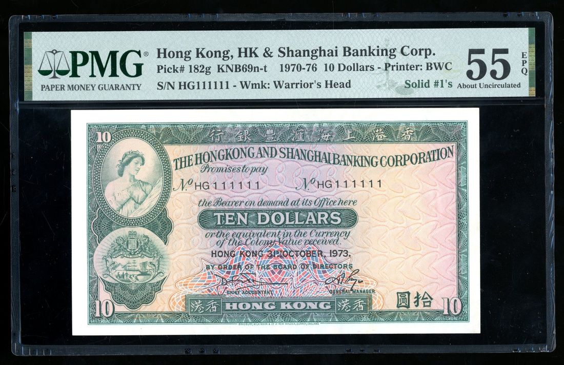 HongKong & Shanghai Banking Corporation, $10, 31.10.1973, solid serial number HG111111, (Pick 182g), PMG 55EPQ