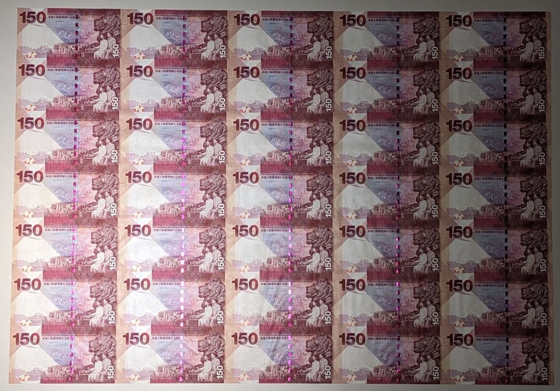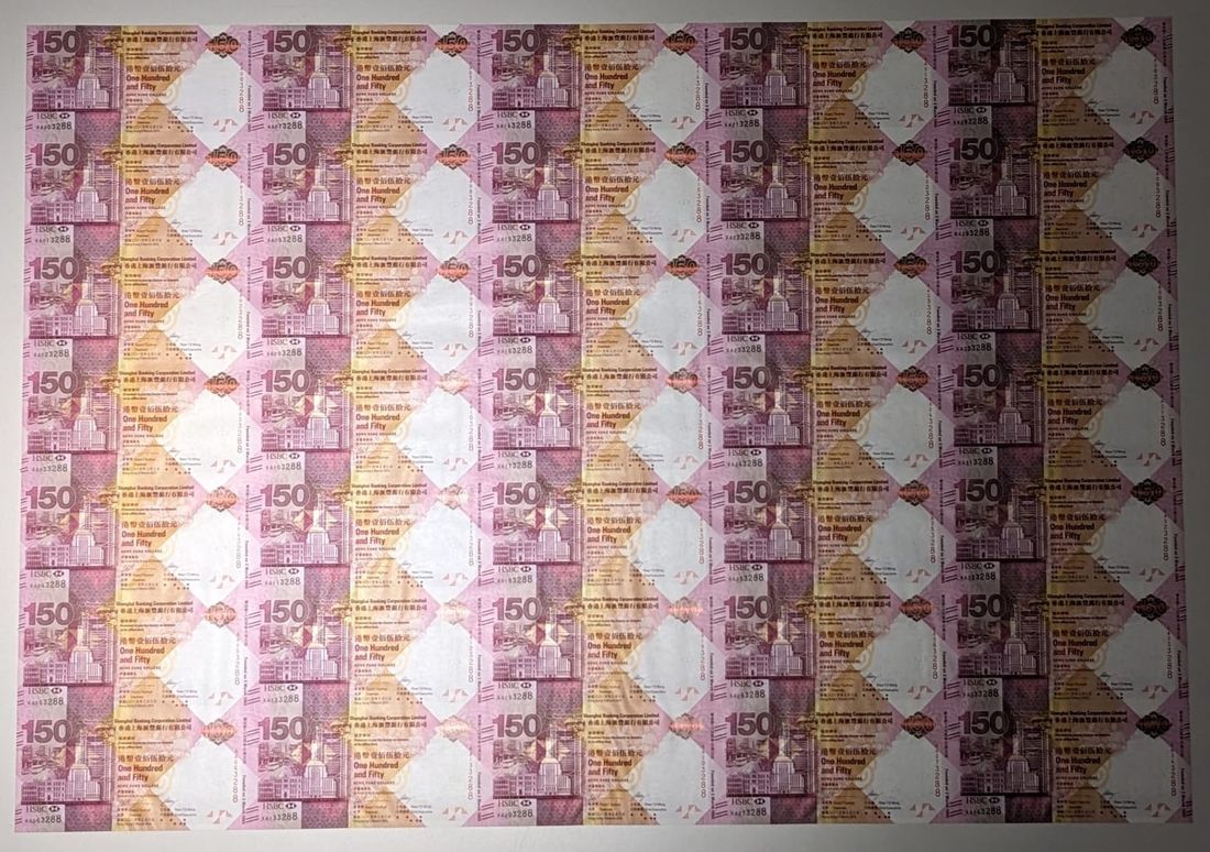 HongKong & Shanghai Banking Corporation, an uncut sheet of 35x $150, 2015, serial numbers ending in 3288, 150th Anniversary of the Bank commemorative issue,