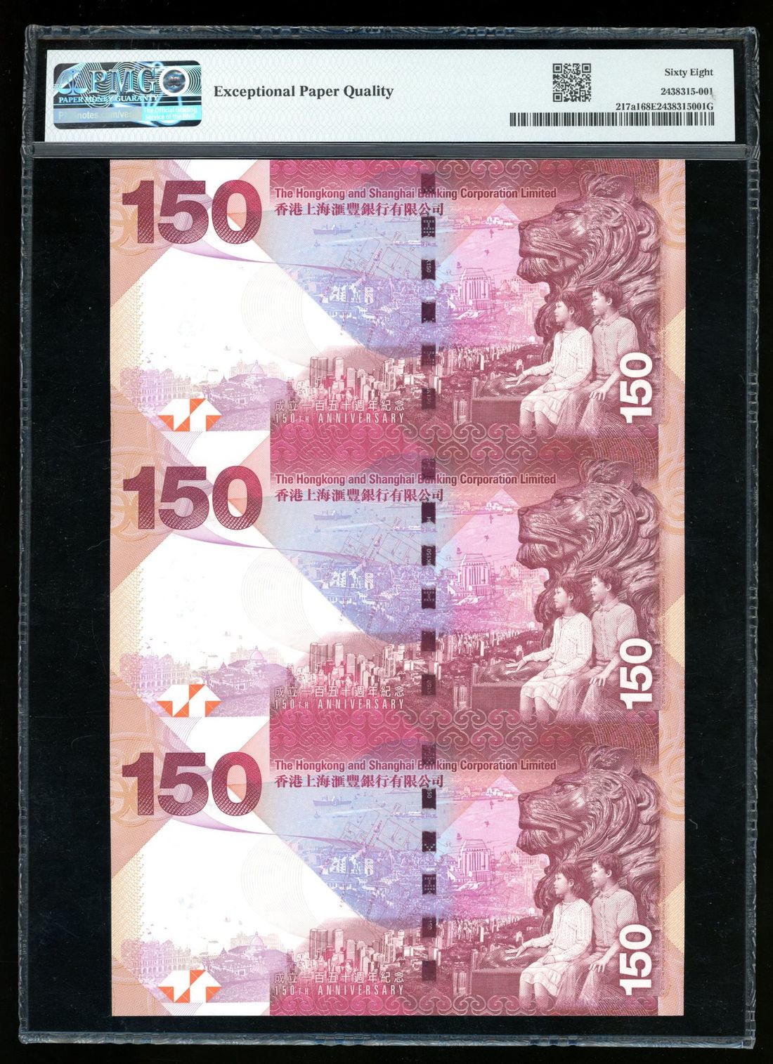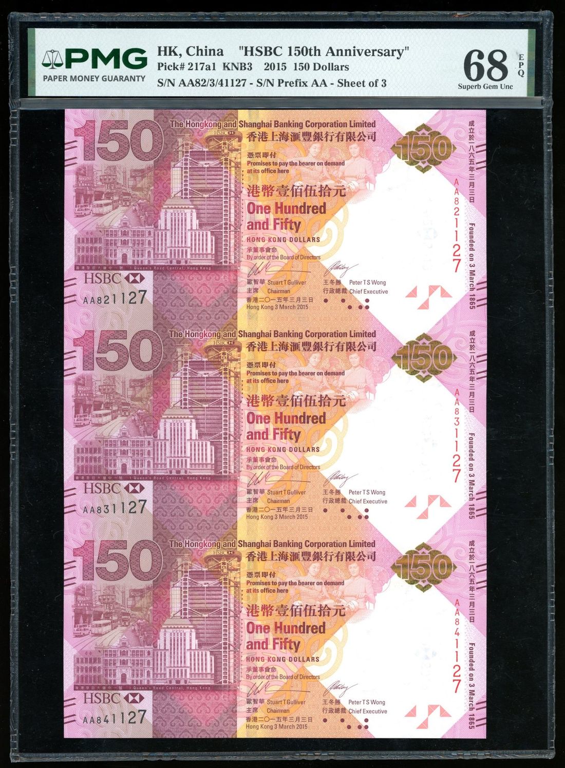 HongKong & Shanghai Banking Corporation, an uncut sheet of $150, 2015, serial numbers AA82/3/41127, (Pick 217a1), PMG 68EPQ