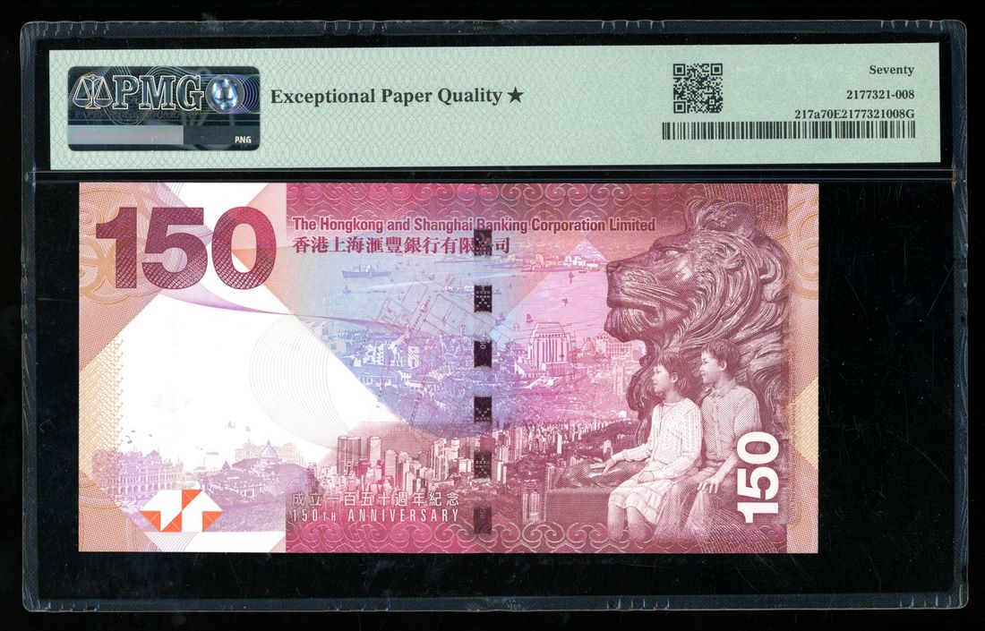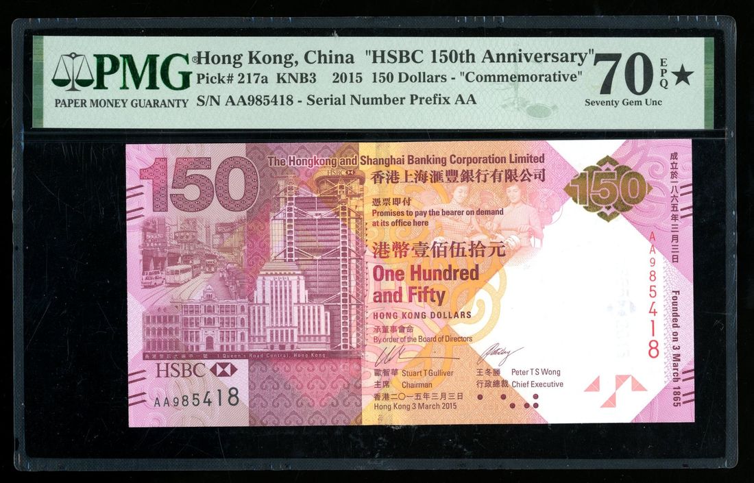 HongKong & Shanghai Banking Corporation, commemorative $150, 2015, serial number AA985418, (Pick 217a), PMG 70*EPQ. One of only 15 in this HIGHEST POSSIBLE GRADE