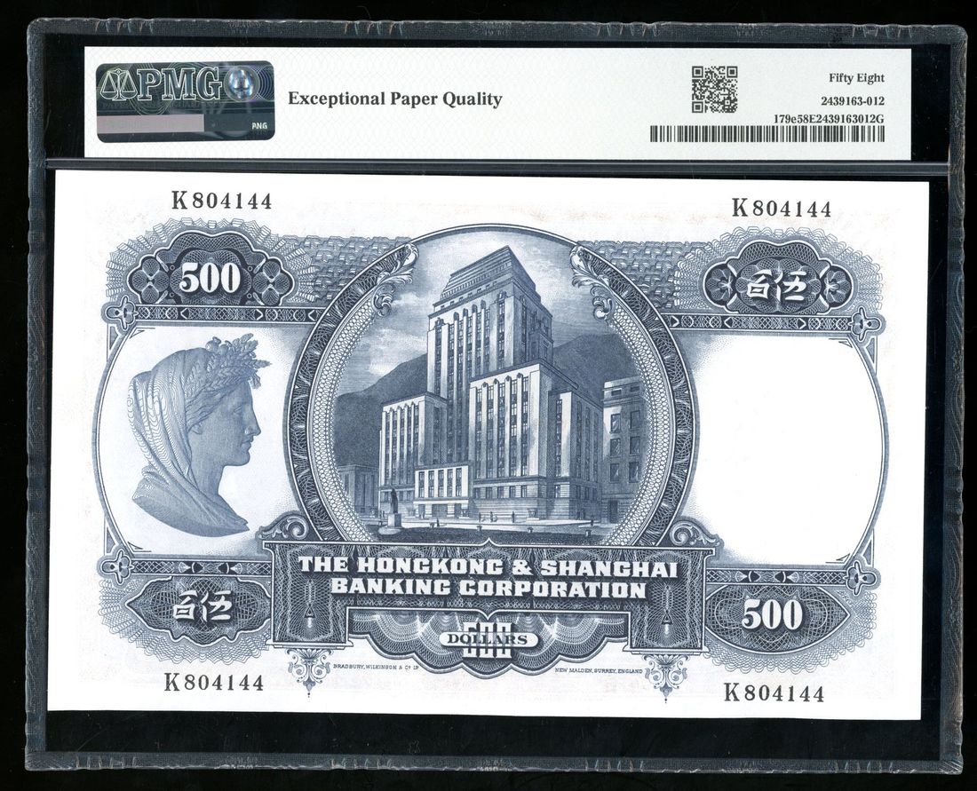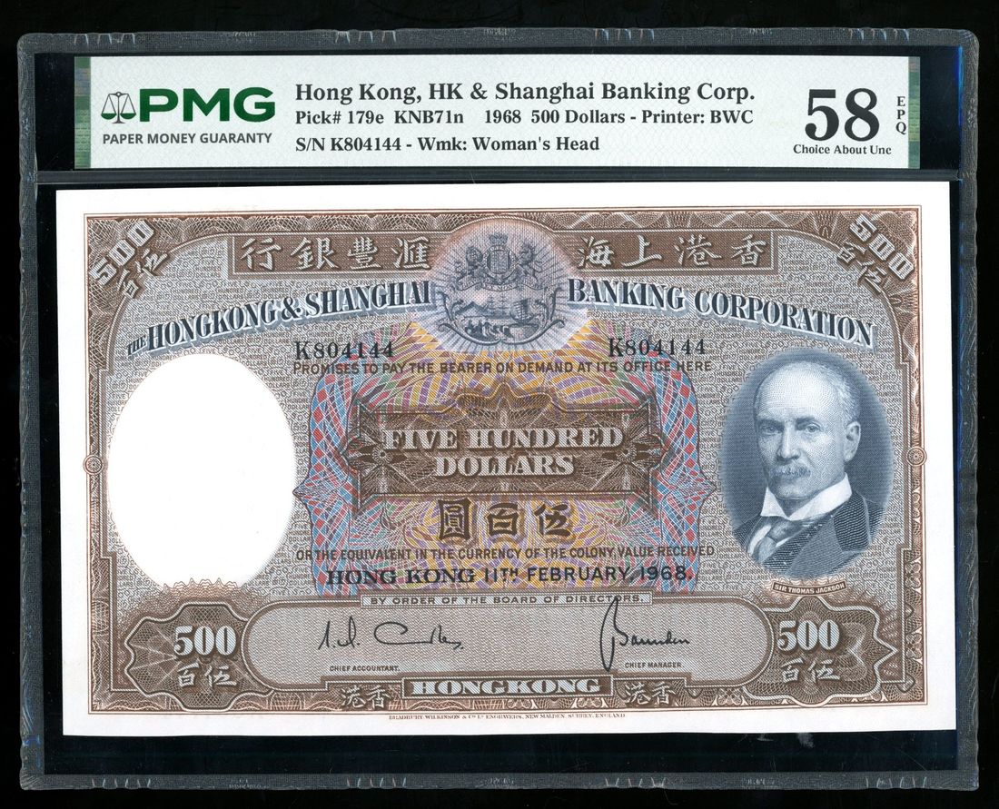 HongKong & Shanghai Banking Corporation, $500, 11.2.1968, serial number K804144, (Pick 179e), PMG 58EPQ