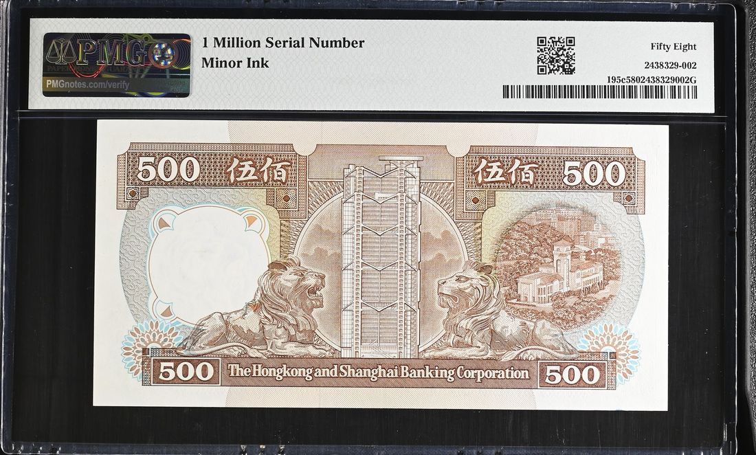 HongKong & Shanghai Banking Corporation, $500, 1.1.1991, 1 million serial number BC1000000, (Pick 195c), PMG 58, minor ink. Always a treat to see 1 million serial number notes especially on a higher denomination. Last note of the BC prefix, makes a nice pair with the previous lot.