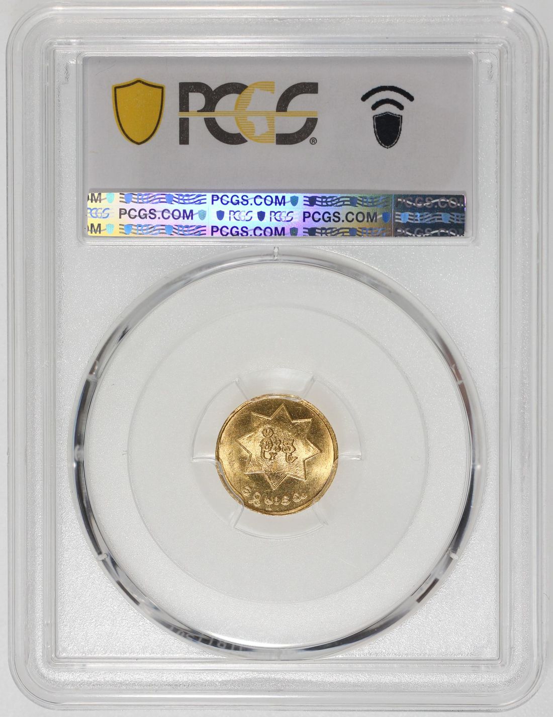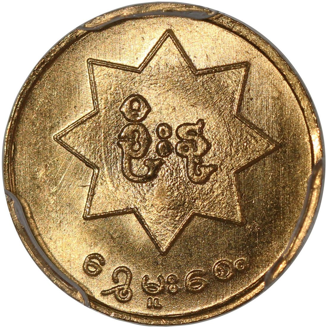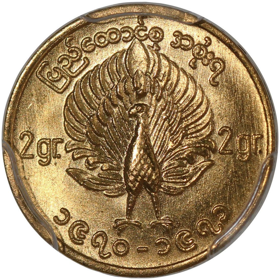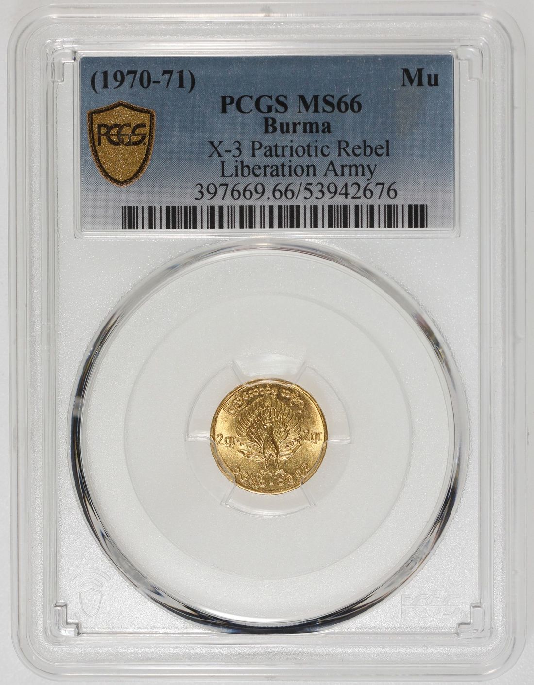 Burma, [PCGS MS66] gold mu, ND (1970-71), Patriotic Rebel Liberation Army issue, peacock facing left on obverse, (X-3), Cert. #53942676. The ruling government deemed the possession of these coins were illegal, hence many were turned in and melted