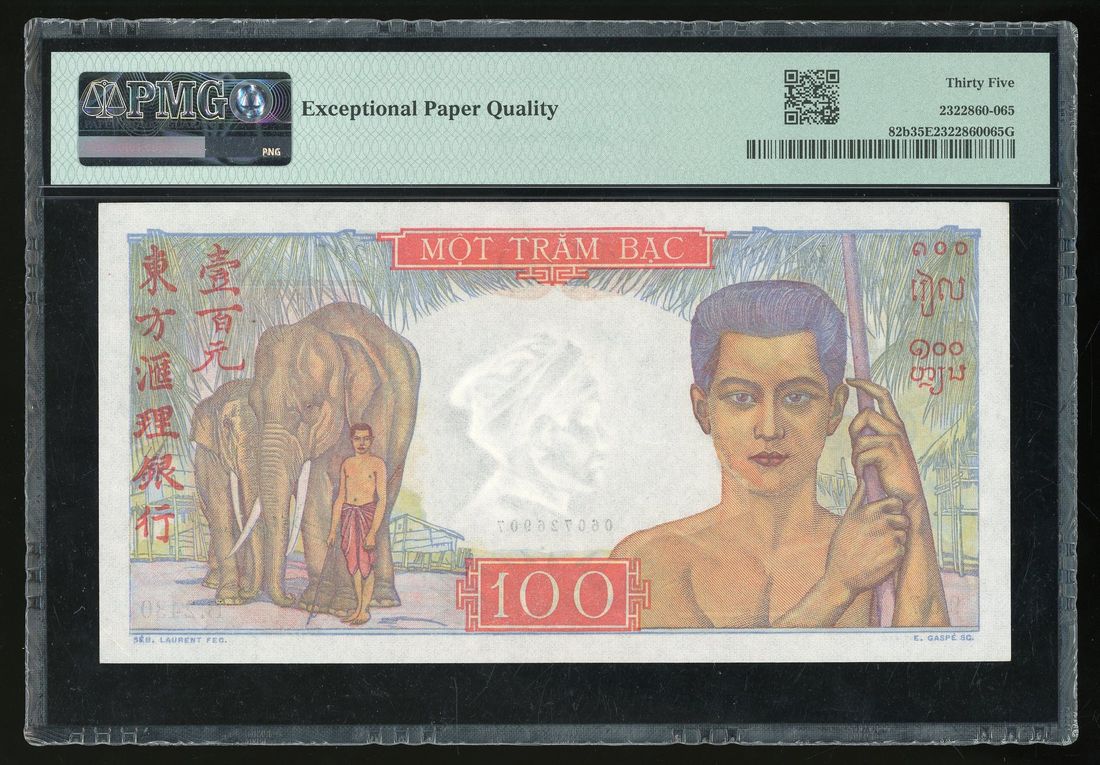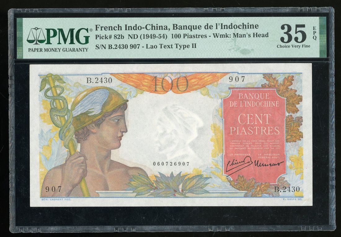 French Indo China, 100 piastres, ND(1949-54), serial number B.2430 907, (Pick 82b), PMG 35EPQ.