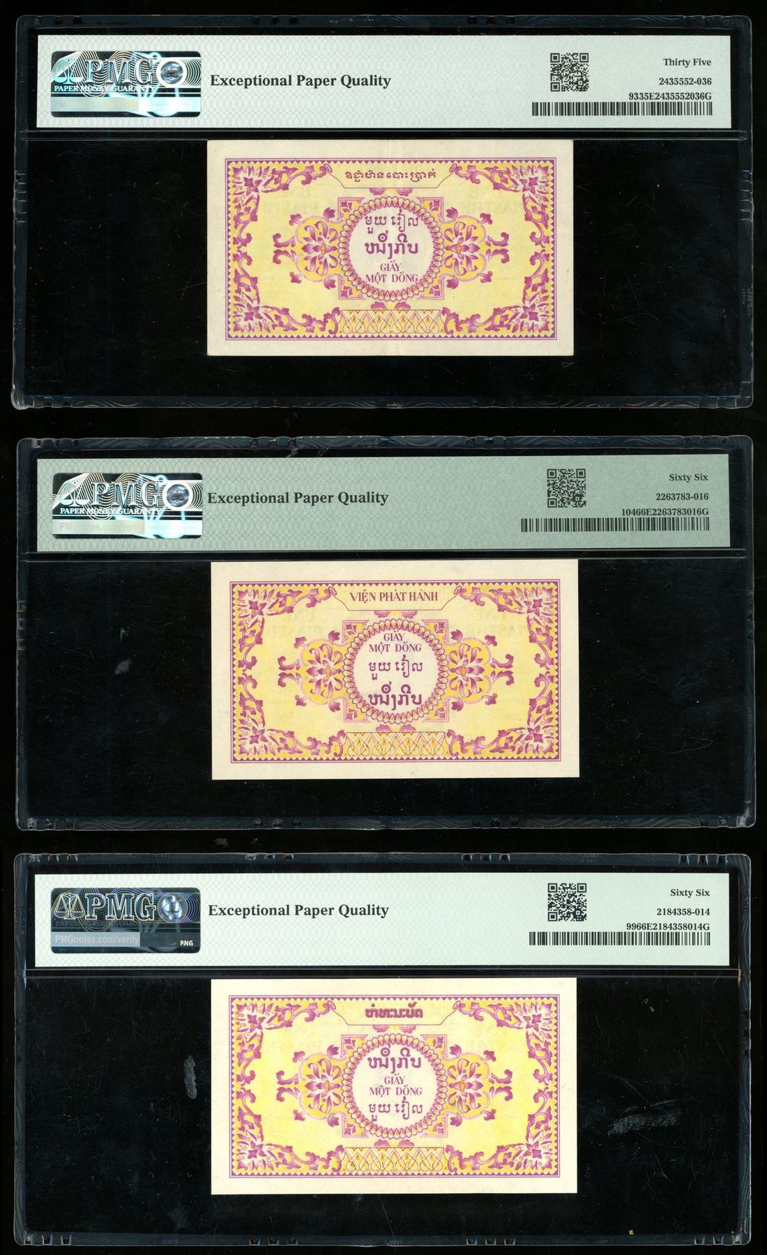 French Indo China, 1 piastre (3), ND (1953), includes Cambodia, Laos and Vietnam issues, (Pick 93, 99, 104), PMG 35EPQ, 66EPQ (PMG census with only 2 better), 66EPQ. Cambodia and Laos issues scarcer (3)