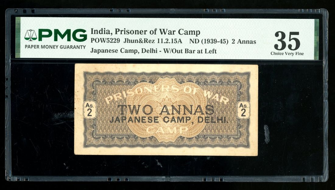 (Campbell-5228, Rezwan 11.2.15A), PMG 35, ink stamp, stains. A lesser known camp in Purana Qila (New Dehli) that housed 2700 Japanese civilians from 1941-1946. They were mainly Singapore and Malaya residents who were arrested and transferred to India where they stayed for part or entirety of the war. 2 annas an uncommon denomination. Interesting and rare
