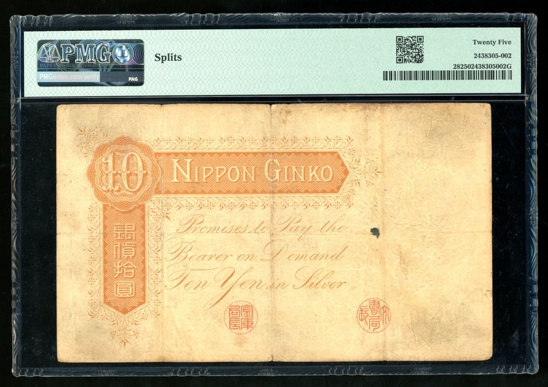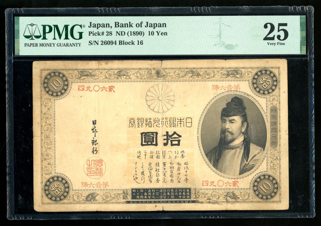 Bank of Japan, 10 yen, ND (1890), serial number 26094, block 16, (Pick 28), PMG 25, splits. A scarce high denomination that equaled to 10 silver coins. Rare in any grade