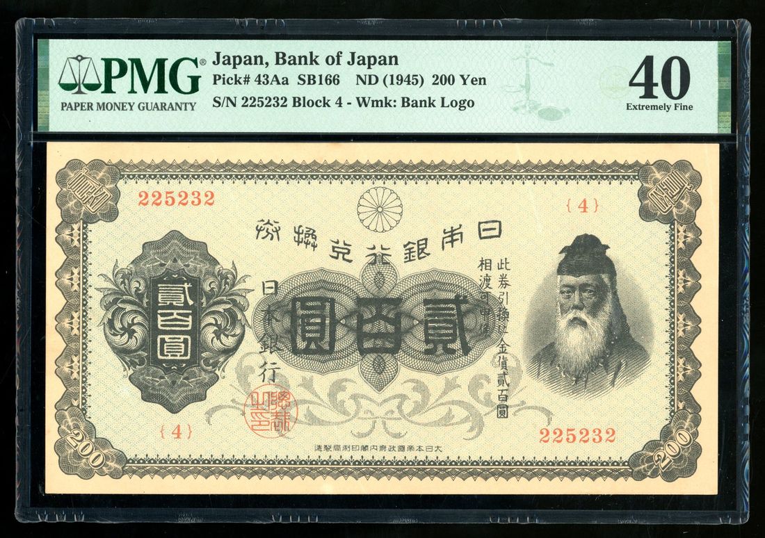Bank of Japan, 200 yen, ND (1945), serial number 225232, block 4, (Pick 43Aa), PMG 40