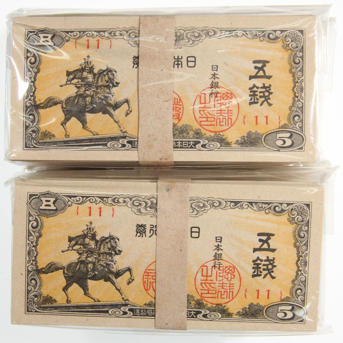 Japan, a lot of 1000x 5 sen, ND(1944-45), block number 11, (Pick 52), 10 bundles, all with original paper wrap, uncirculated.(1000)