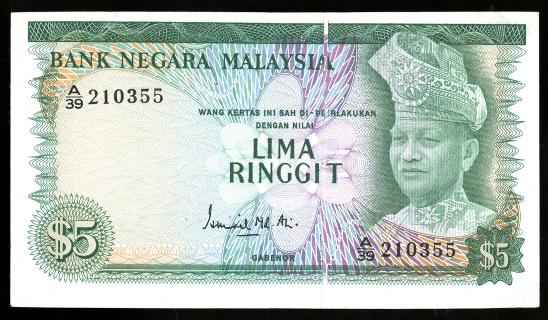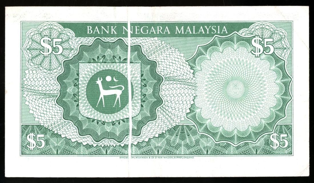 Bank Negara Malaysia, ERROR 5 ringgit, ND (1967), serial number A/39 210355, folding printing obstruction error,