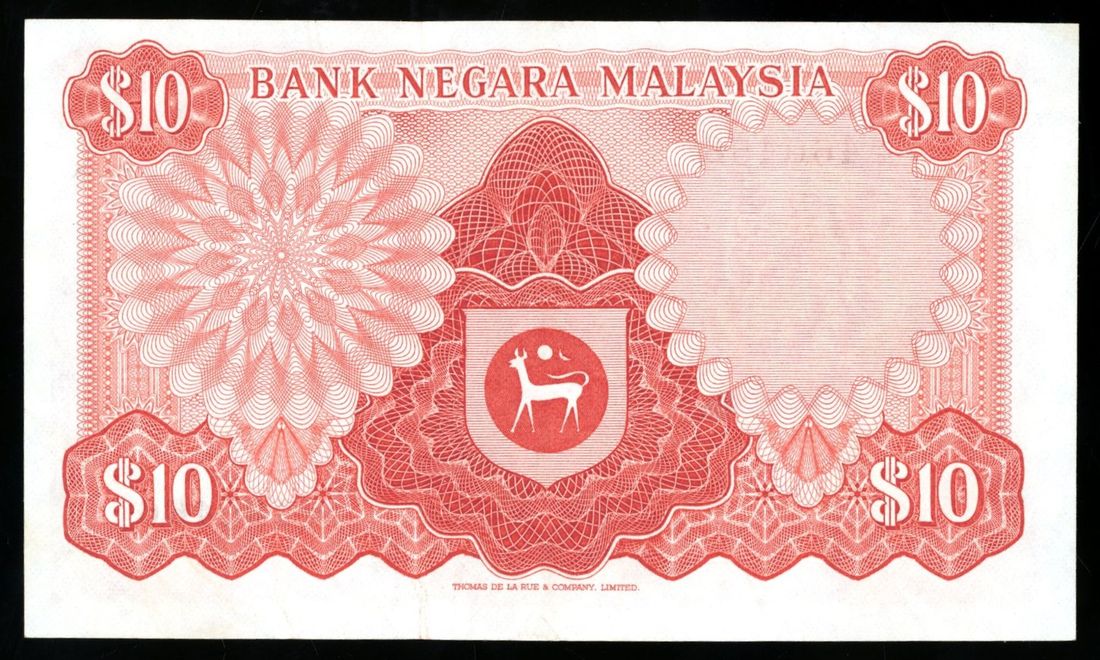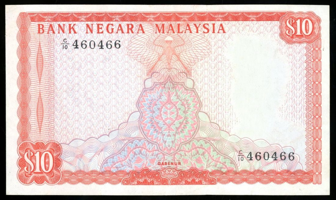 Bank Negara Malaysia, ERROR 10 ringgit, ND (1972), serial number B/10 460466, missing portrait at right and signature,