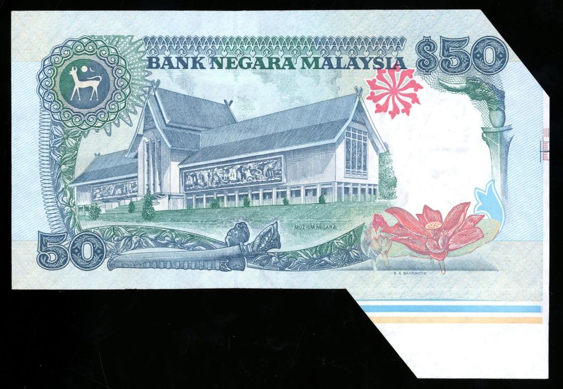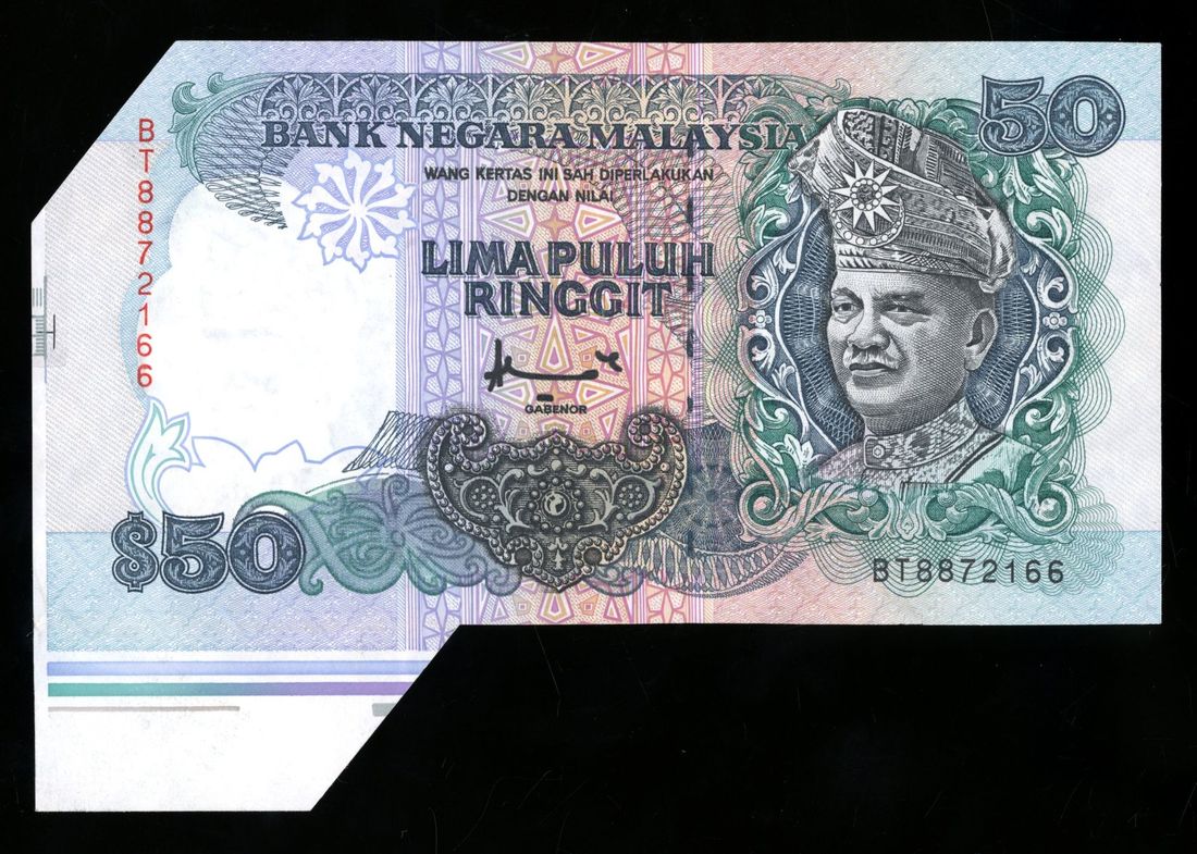 Bank Negara Malaysia, ERROR 50 ringgit, ND (1997), serial number BT8872166, extra paper at lower left and cutting error at top left,