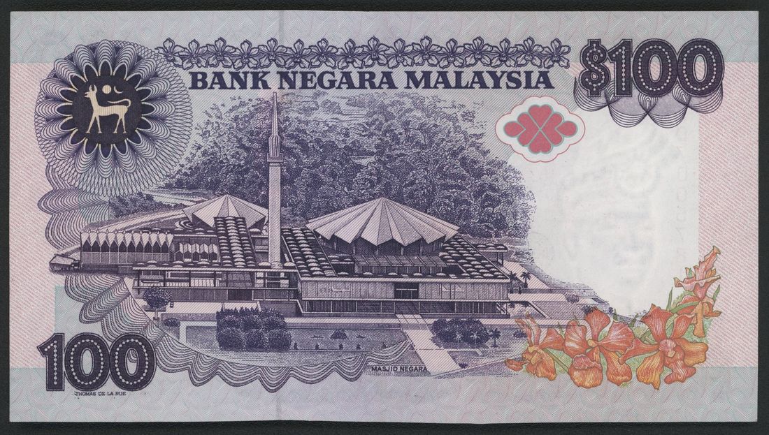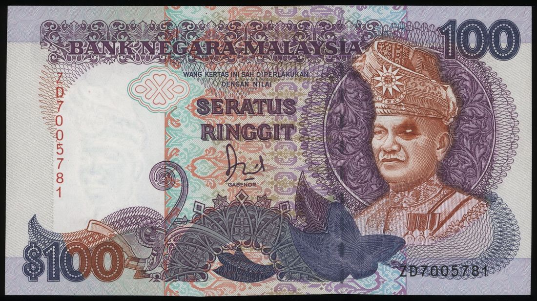 Bank Negara Malaysia, ERROR 100 ringgit, ND (1989), serial number ZD7005781, ink smudge and obstruction error at eye,