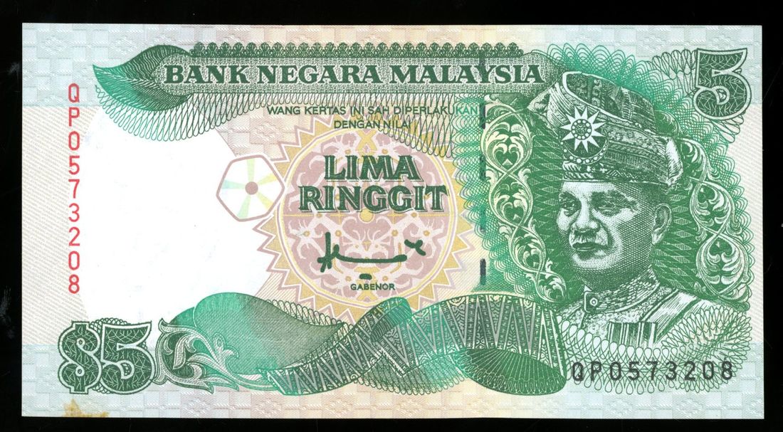 Bank Negara Malaysia, ERROR 5 ringgit, ND (1998), serial number QP0573208, reverse printing error with overprints completely missing,