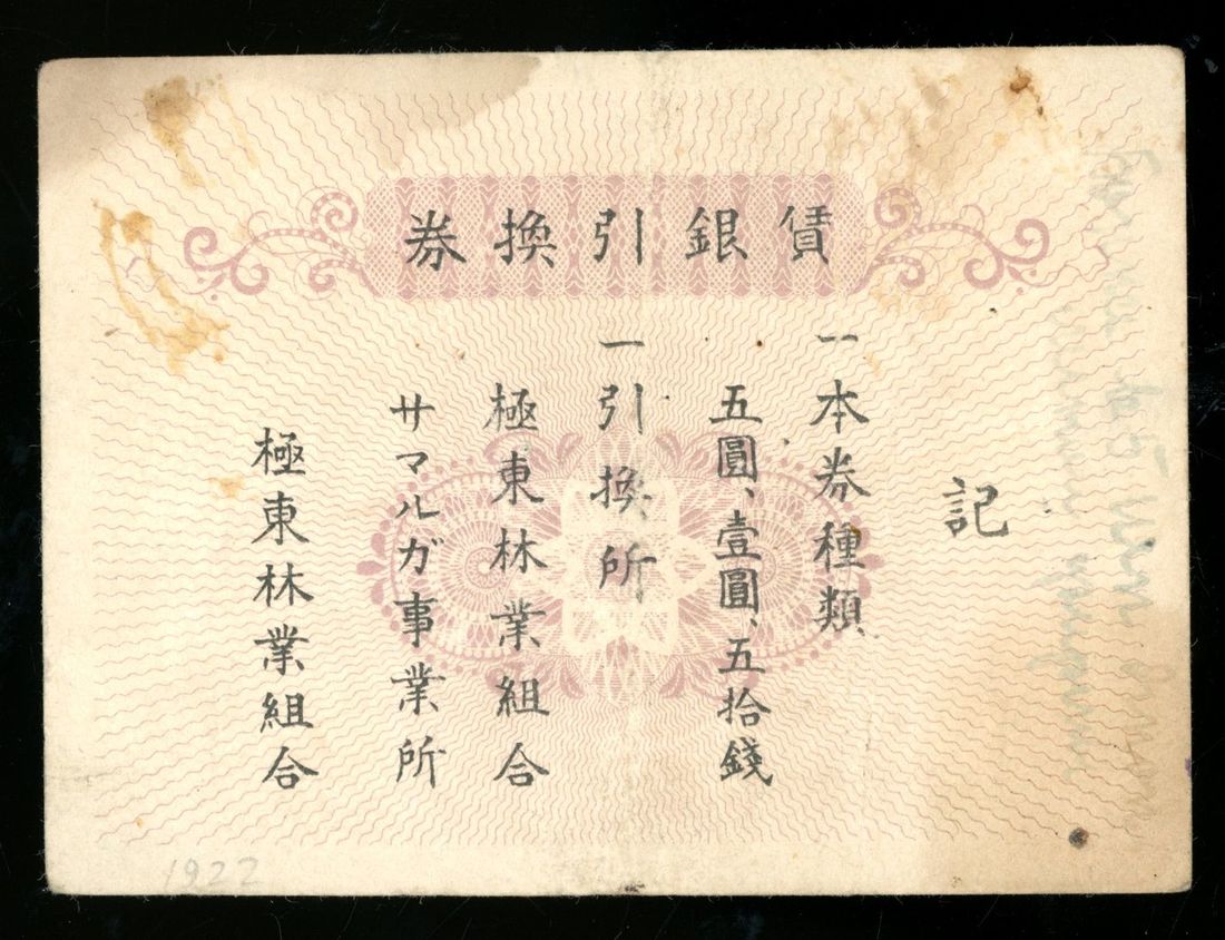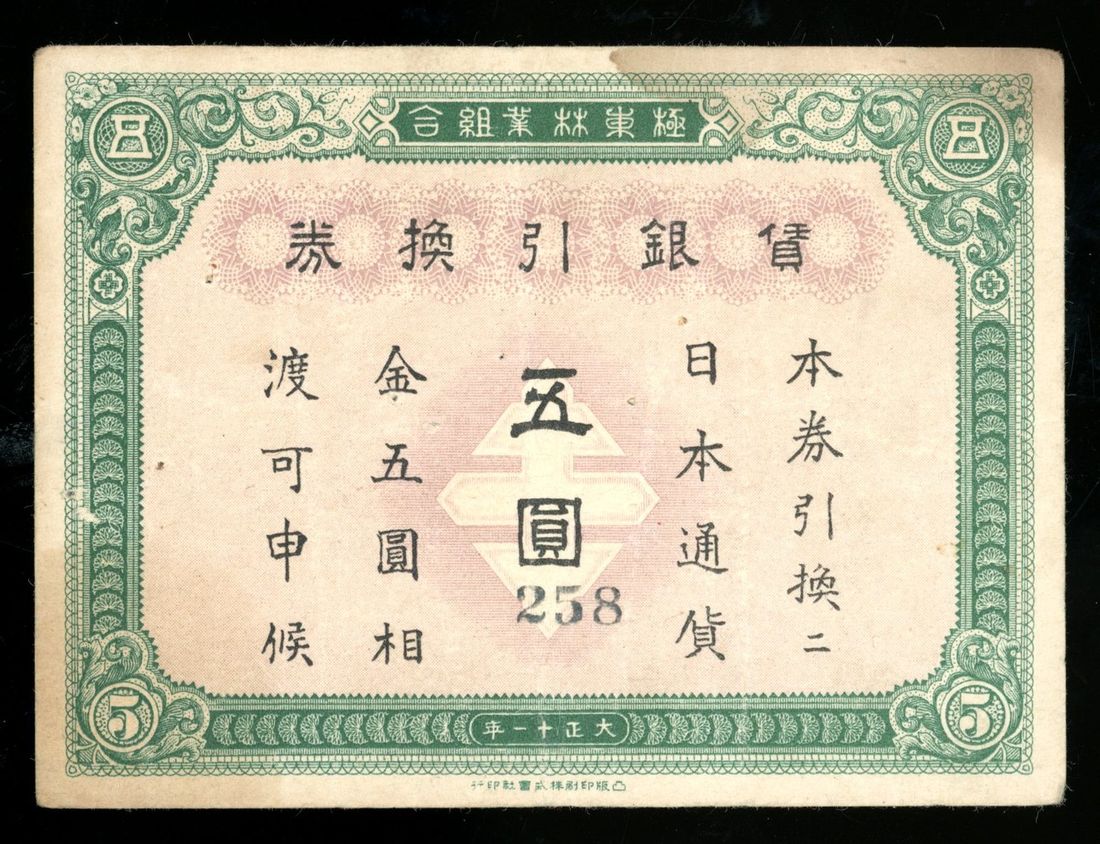 Far Eastern Timber Company, Russia / Siberia, 5 yen, Taisho Year 11 (1922), serial number 258, printed by Toppan Printing Factory, reverse text "denominations of 50 sen, 1 and 5 yen issued",