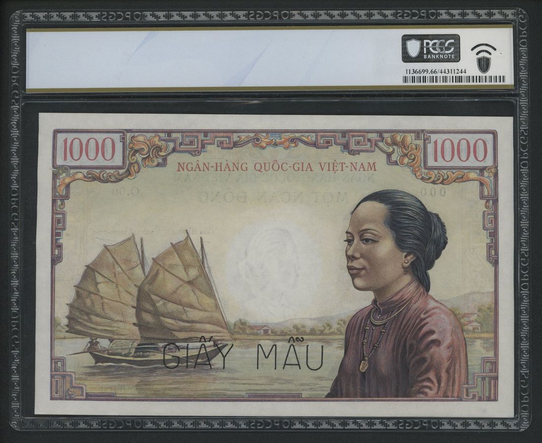 National Bank of Vietnam, specimen 1000 Dong, ND (1956), serial number O.00 000, old man at left, temple at right, reverse junk boat at left, woman at right,
