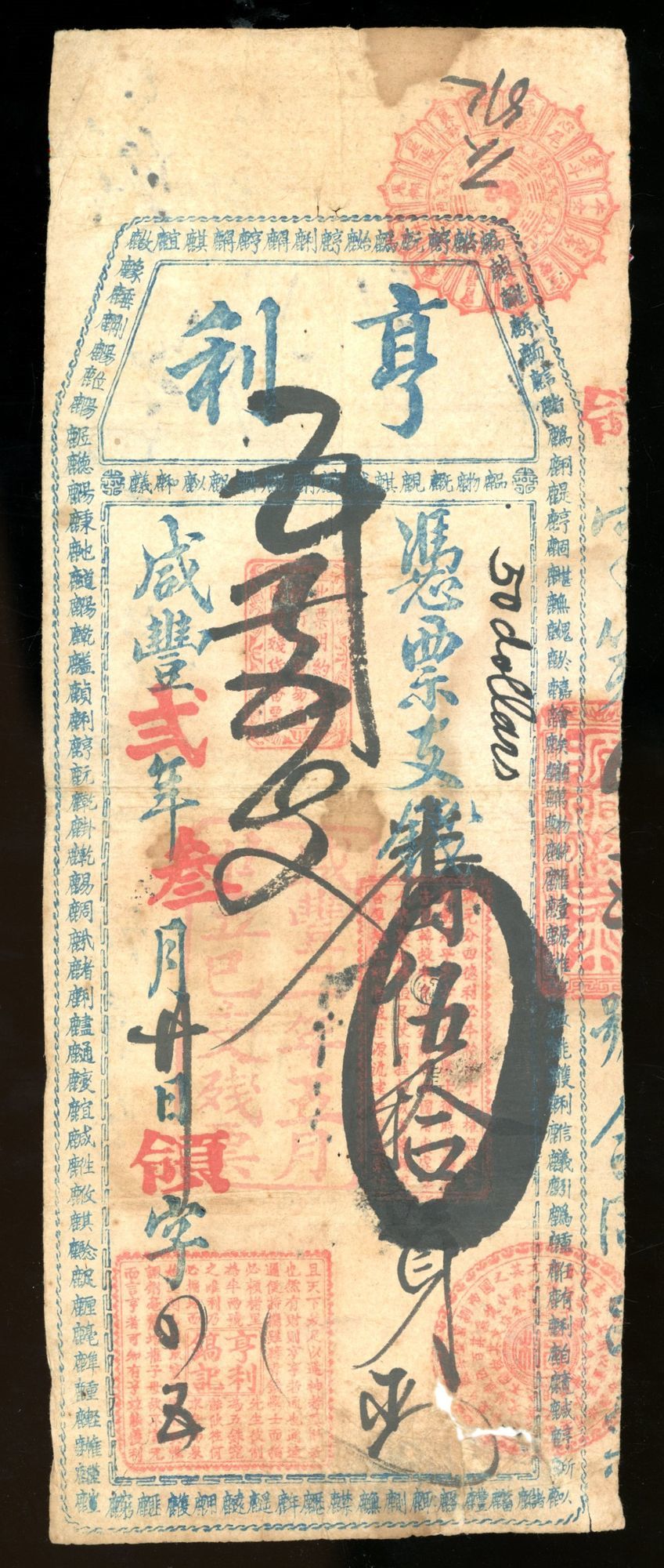 (x) China, Private Issue, Heng Li, "fan" 50 dollars, XianFeng Year 2 (1852), with ink writing and chops, fine. This is one the earliest banknote issue in Fukien, note the used of "fan" which described foreign silver dollars like Mexican 8 reales. A large amount of money for back in 1852. Rare and interesting