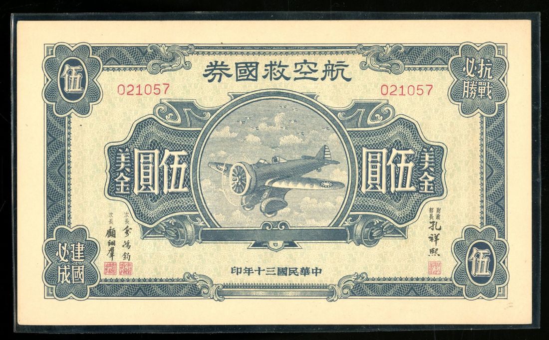 (x) National Salvation Aviation Bond, China, US$5, Year 30 (1941), serial number 021057, blue, aircraft at centre,