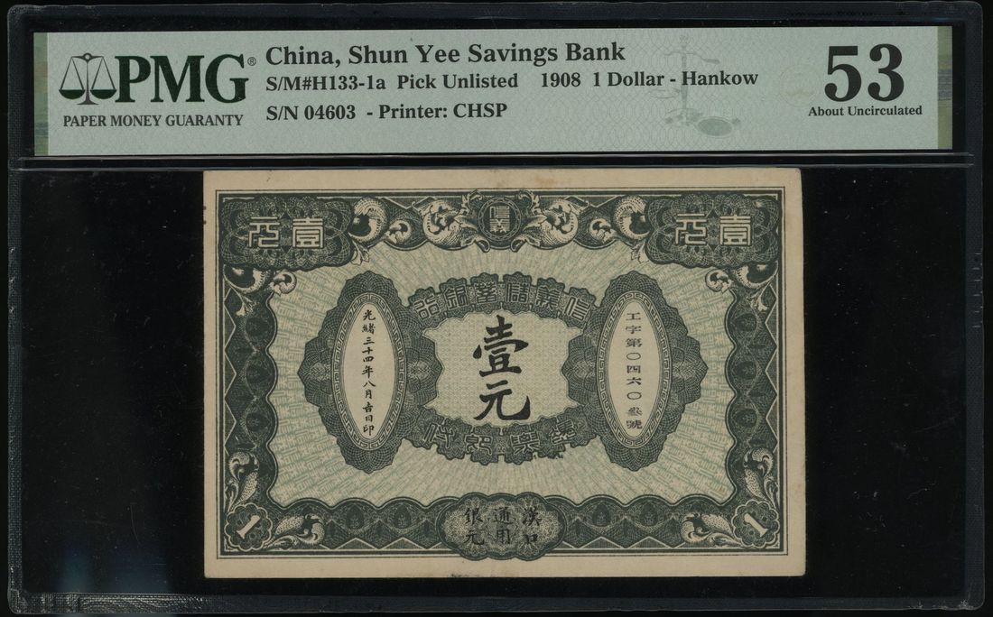 (x) Shun Yee Savings Bank, China, 1 yuan, Hankow, 34th Year of Guangxu (1908), serial number 04603, prefix Gong, green, reverse orange,