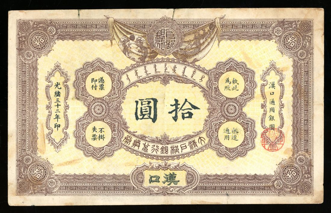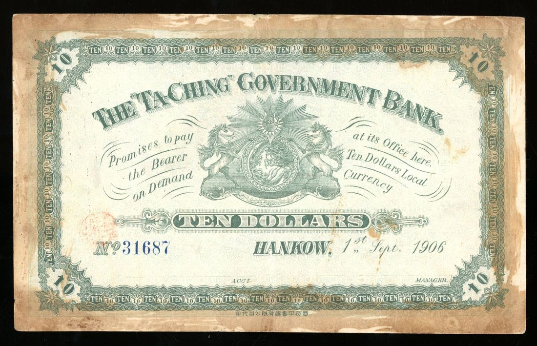 (x) Ta-Ching Government Bank, China, remainder 10 yuan, 1.9.1906, Hankow, serial number 31687, (Pick A65r), very fine, nonetheless quite rare