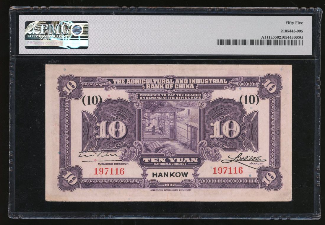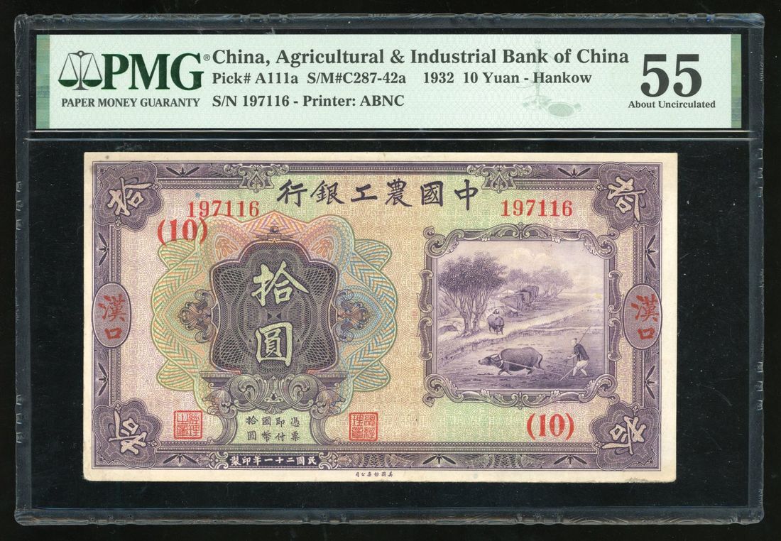 Agricultural and Industrial Bank of China, 10 yuan, 1932, Hankow, serial number 197116, purple and multicolour, ploughing at right, value at left, reverse purple, woman weaving at centre,
