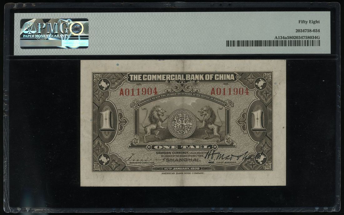 (Pick A134a), PMG 58. A later denominated in taels, interesting. PMG census TOP POP, one of two