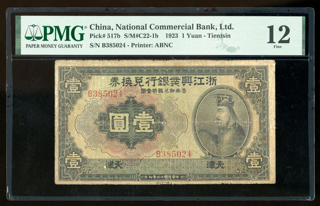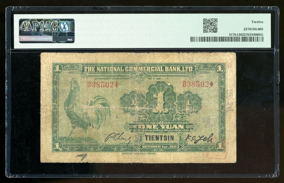 (x) National Commercial Bank, China, 1 yuan, 1923, Tientsin, serial number B 385024, (Pick 517b), PMG 12, one of only two in the PMG census! All issued notes from National Commercial Bank are SCARCE