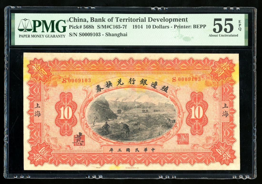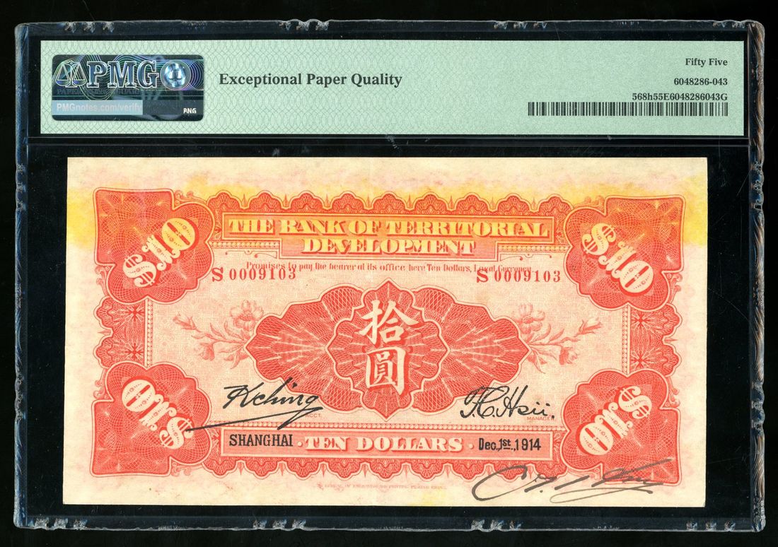 (x) Bank of Territorial Development, China, 10 yuan, Year 3 (1914), Shanghai, serial number S0009103, (Pick 568h), PMG 55EPQ. PMG census with only 1 better at 58 making this a TOP POP EPQ example