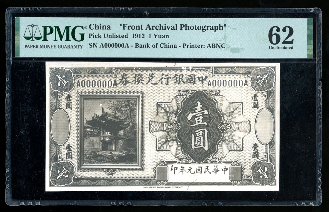 (x) Bank of China, obverse photographic proof for unissued design of 1 yuan, Year 1 (1912), black and white, building vignette at left,