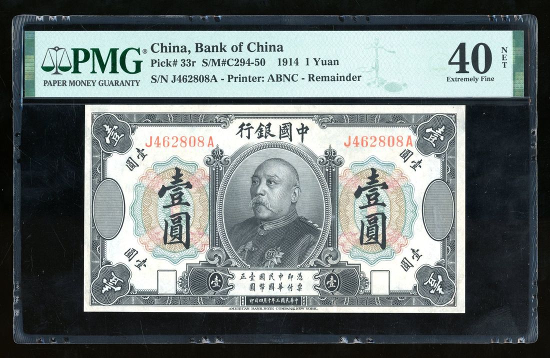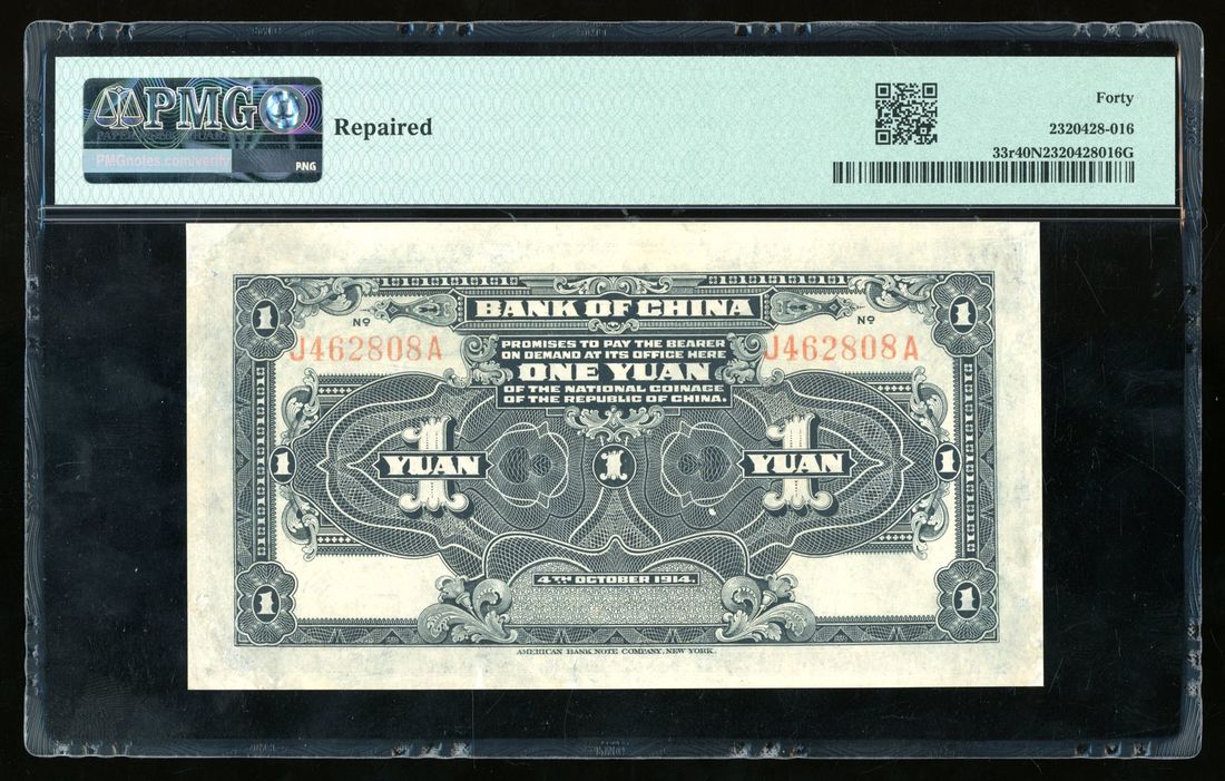 (x) Bank of China, remainder 1 yuan, 1914, serial number J462808A, black and multicoloured vignette, portrait of Yuan Shih Kai at centre,