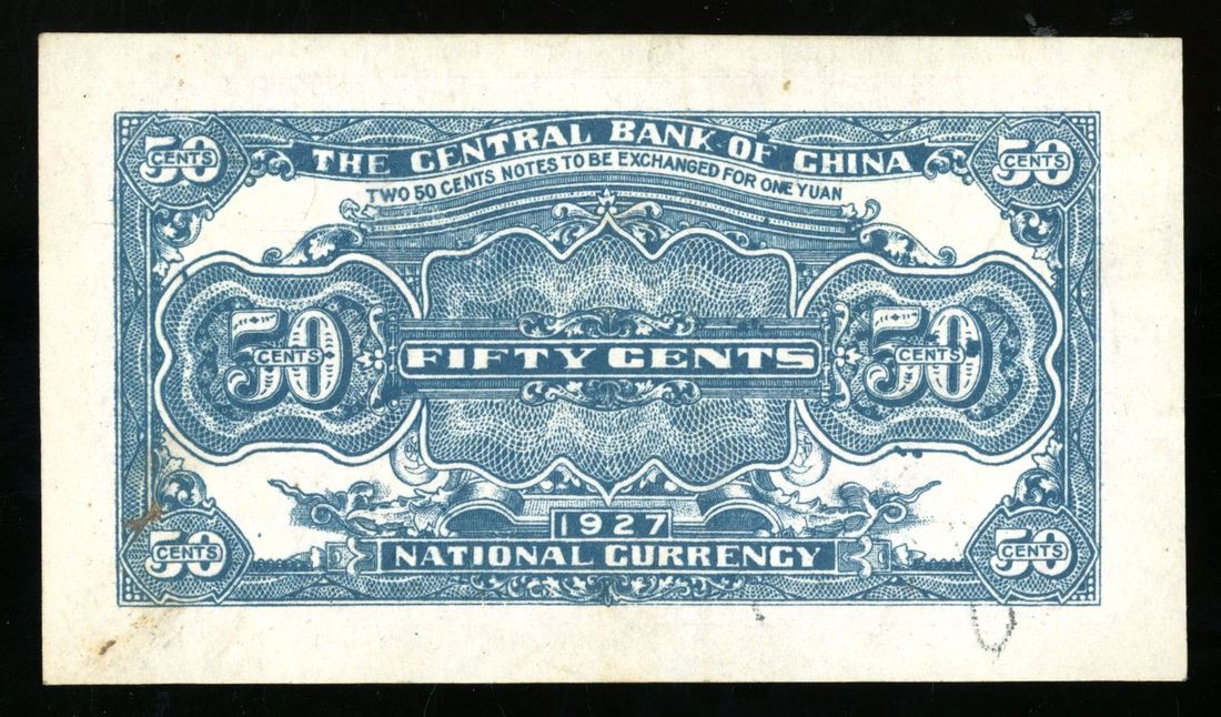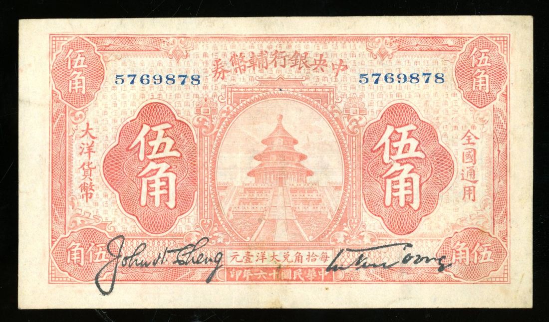 Central Bank of China, 5 jiao, Year 16 (1927), serial number 5769878, (Pick 192), minor stain, original paper extremely fine. Scarce type and in well above average condition