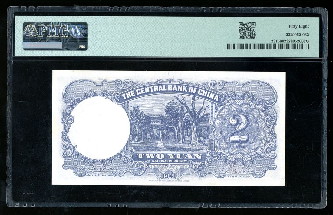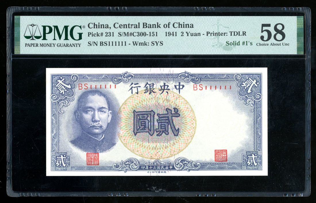 (x) Central Bank of China, 2 yuan, Year 30 (1941), solid serial number BS111111, (Pick 231), PMG 58. Any fancy serial number notes on vintage notes