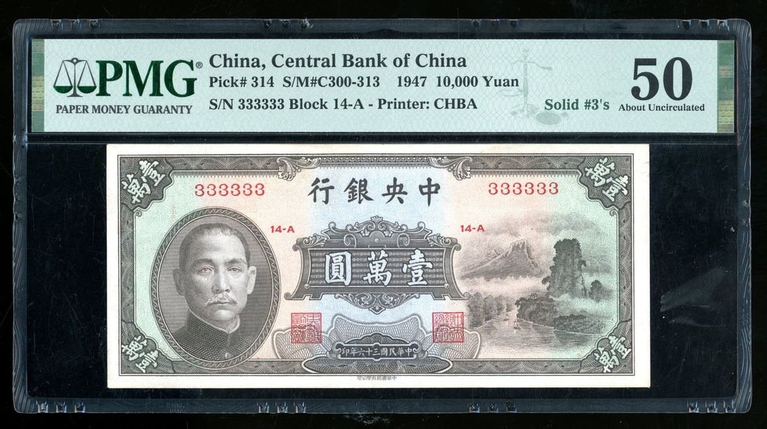 (x) Central Bank of China, 10,000 yuan, Year 36 (1947), solid serial number 333333, block 14-A, (Pick 314), PMG 50. Solid serial numbers very tough to find