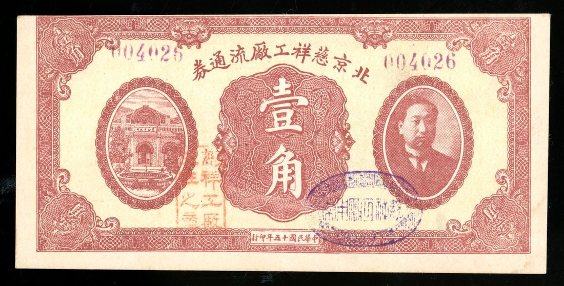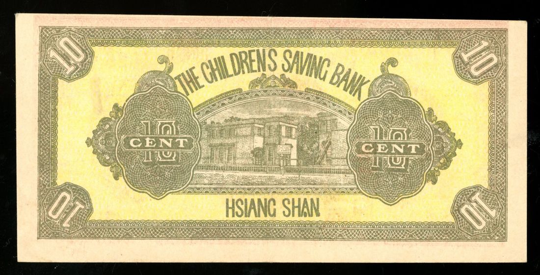 (x) The Children's Saving Bank, China, 10 cent, Year 15 (1926), serial number 004026, red and yellow, Xiong Xiling at right (premier and finance minister of China from July 1913 to February 1914. Also a philanthropist who opened various orphanage, kindergarten, vocational schools etc in Beijing and Shanghai),