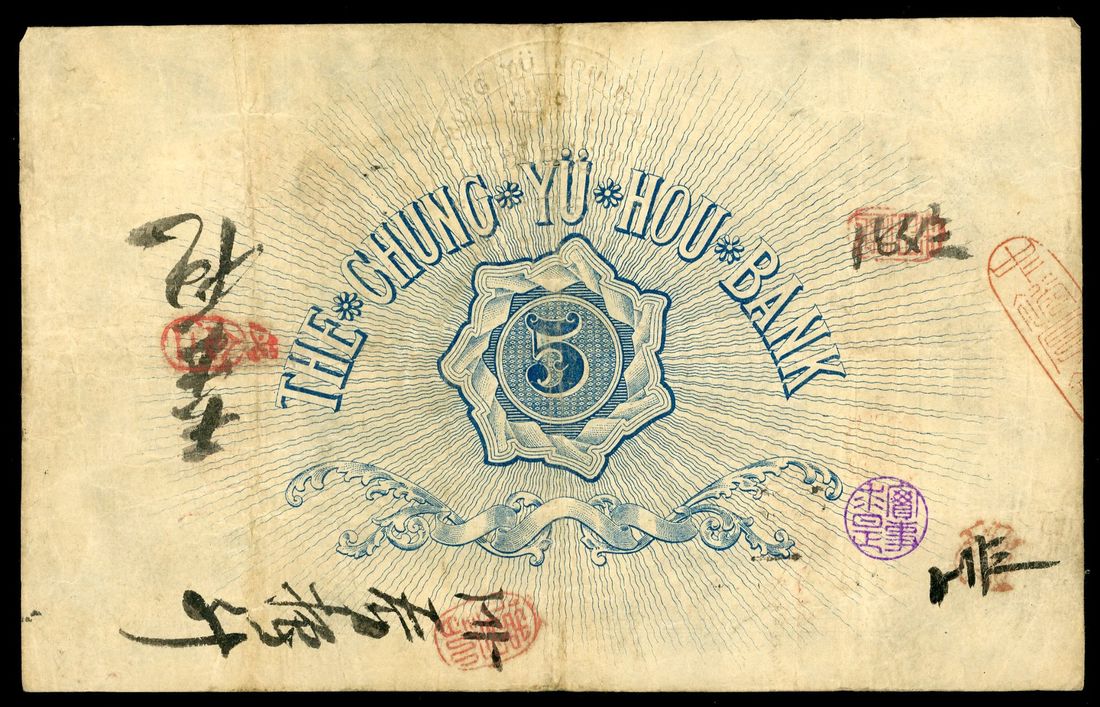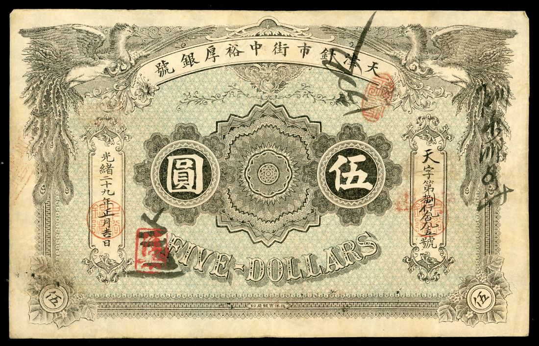 The Chung Yu Hou Bank, Private Issue, China, $5, 29th Year of Guang Xu (1903), 'Tian' prefix serial number 8995, black printing on blue, facing phoenixes at upper left and right, denomination in Chinese and English, reverse blue, bank title in English,