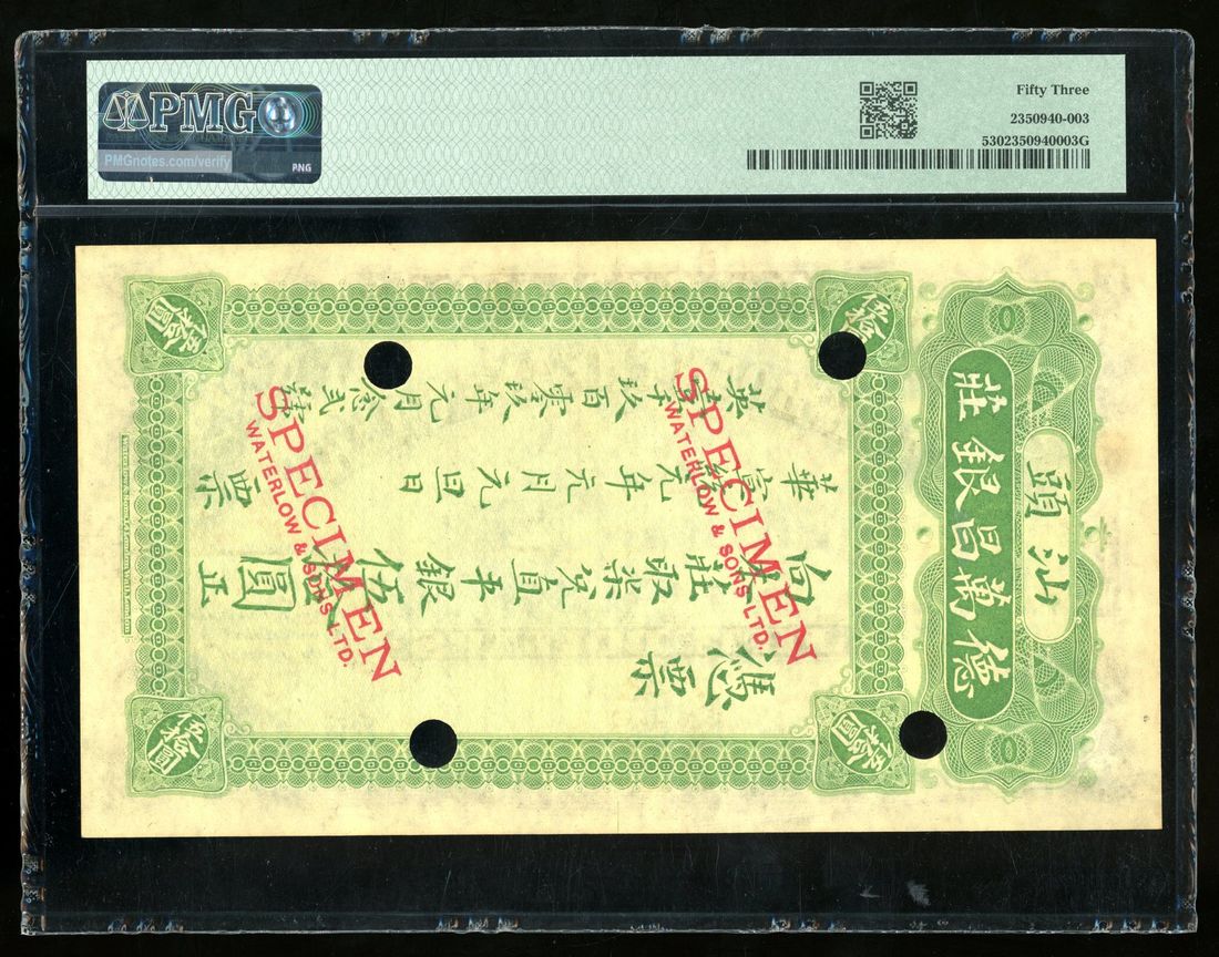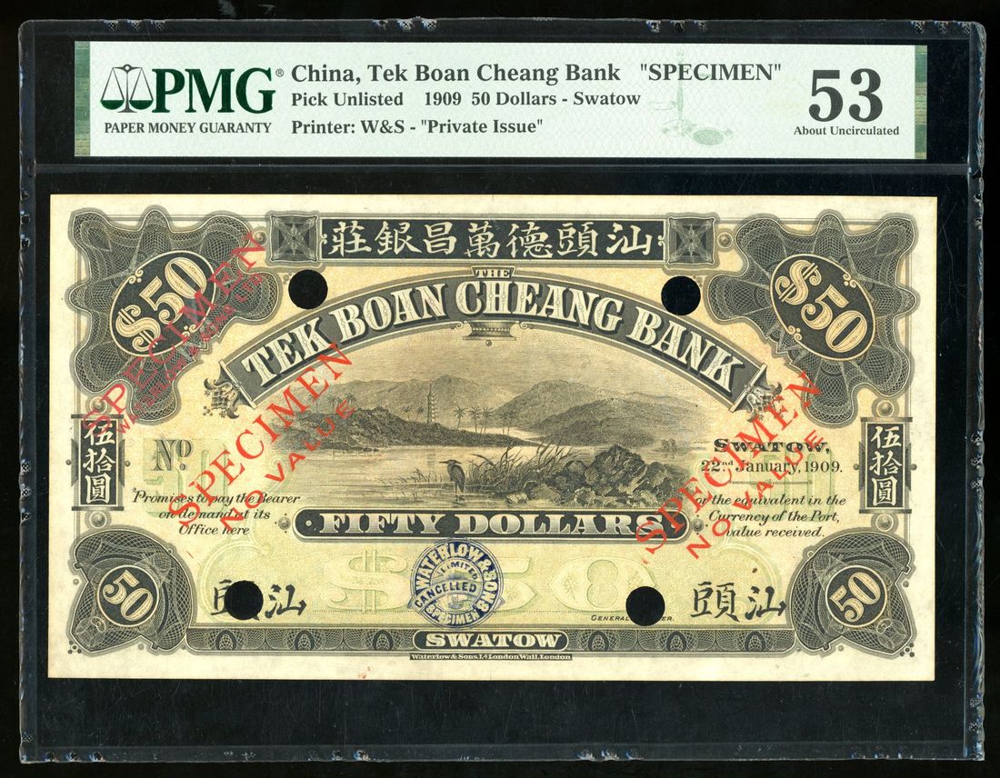 Tek Boan Cheang Bank, Swatow, China, specimen 50 yuan, 22.1.1909, no serial number, black and green, river scene at centre, reverse in vertical format, green,