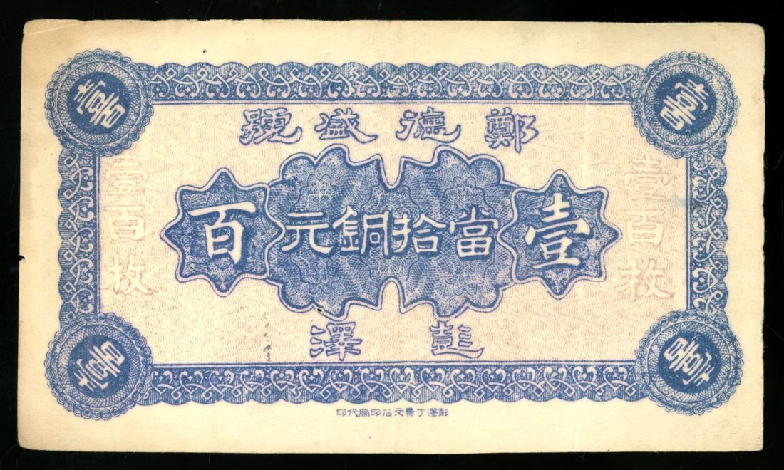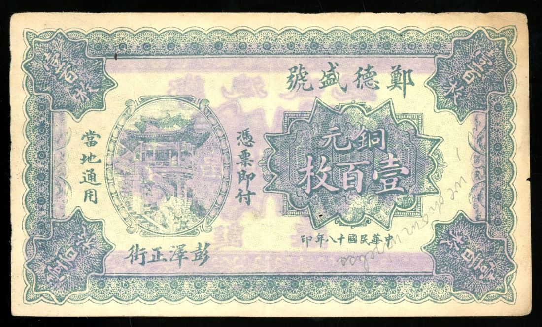 (x) Zheng De Sheng Hao, Jiangxi Province, Private Issue, China, remainder 100 cash, Year 18 (1929), Penngze, no serial number pinholes, splits, annotations, very fine. A locally printed and circulated issue. Quite unusual