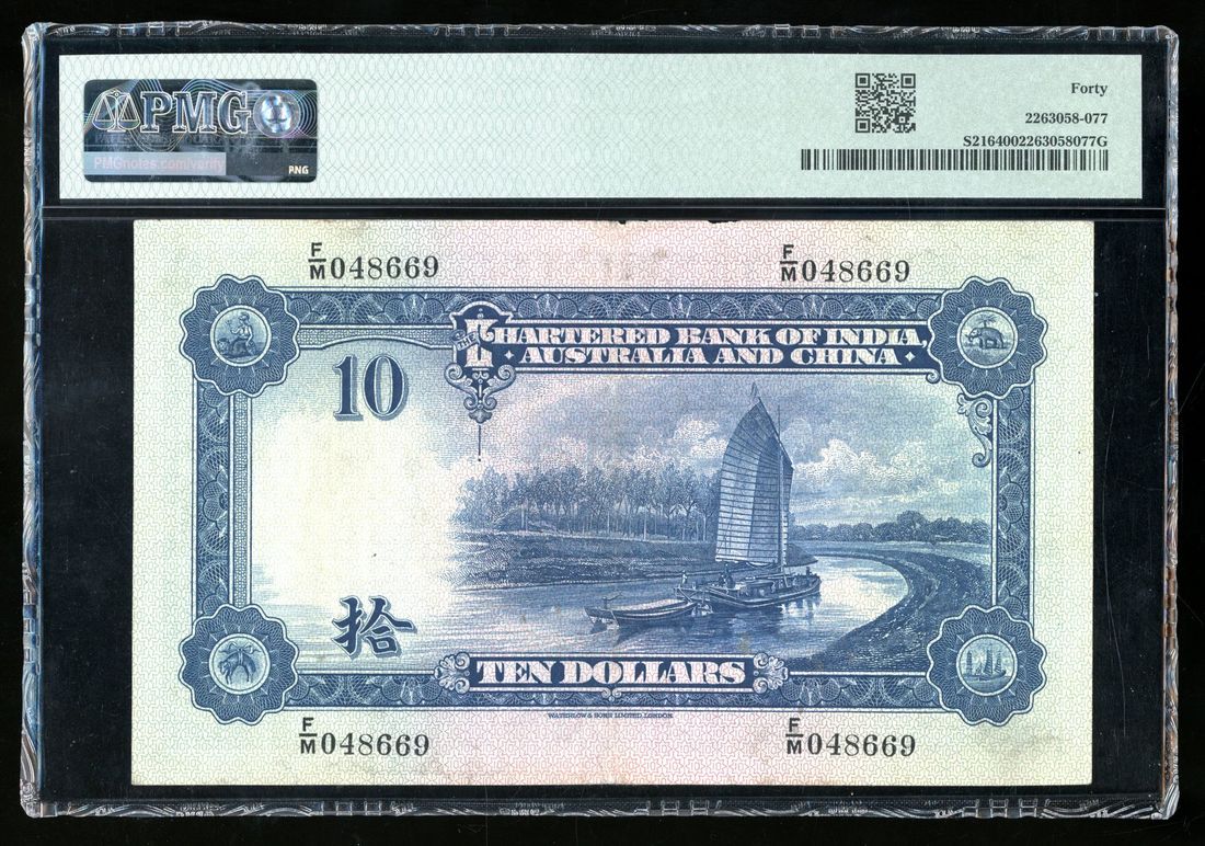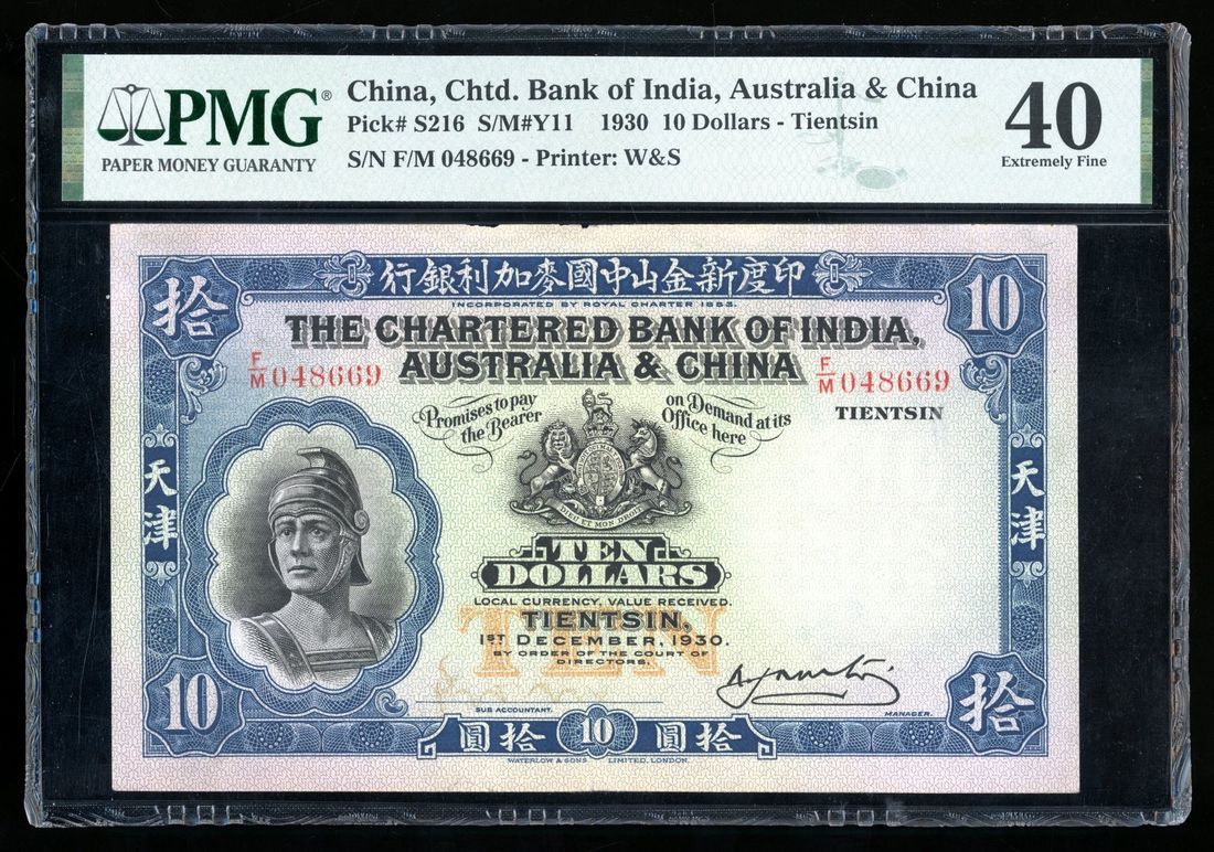 (Pick S216), PMG 40. An iconic China foreign bank type. Though a China issue, but still fits very nicely with the Hong Kong Chartered Bank 1929-56 'Roman Head' series. Handsome high grade example for type with only 2 better on PMG Census. Scarce!