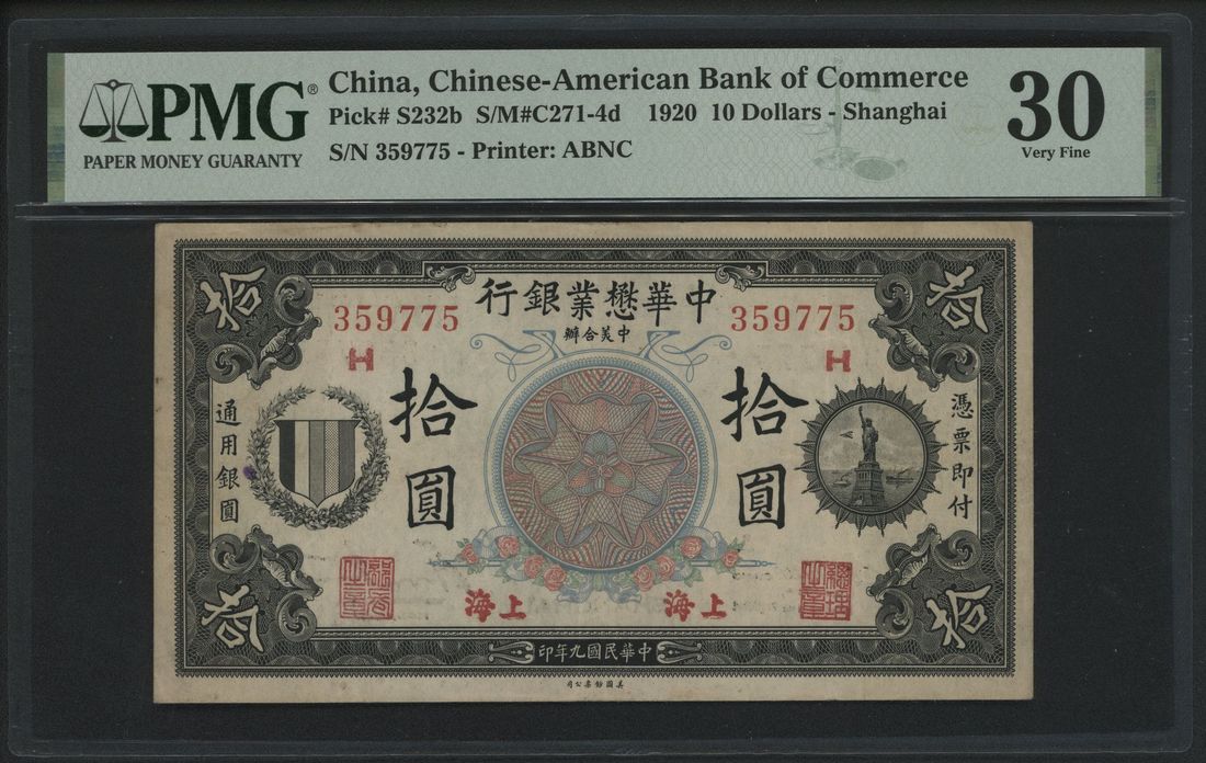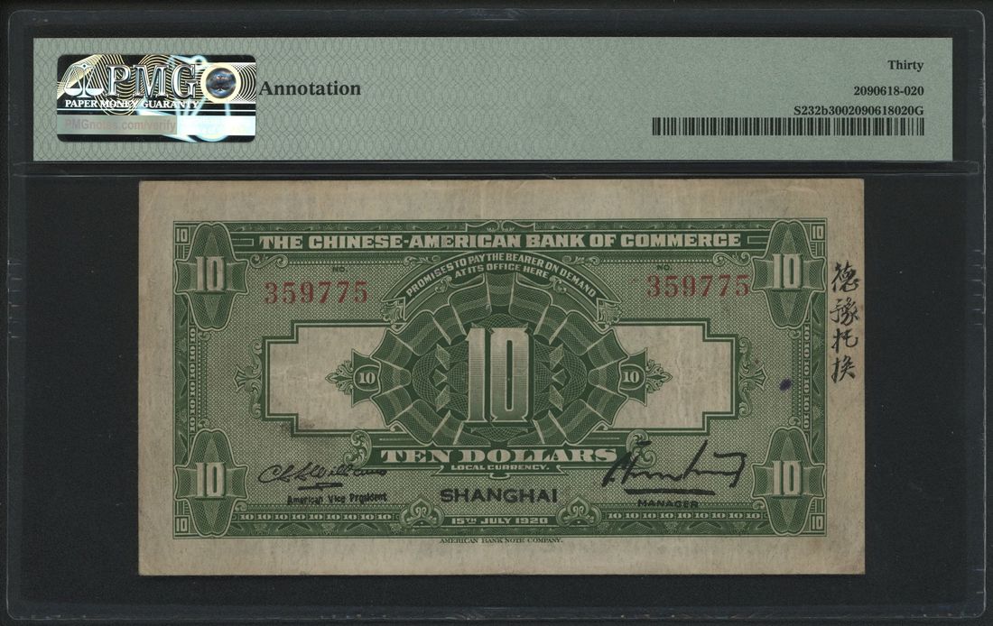 (x) Chinese-American Bank of Commerce, 10 yuan, Year 9 (1920), Shanghai, serial number 359775, with 'H' stamps,