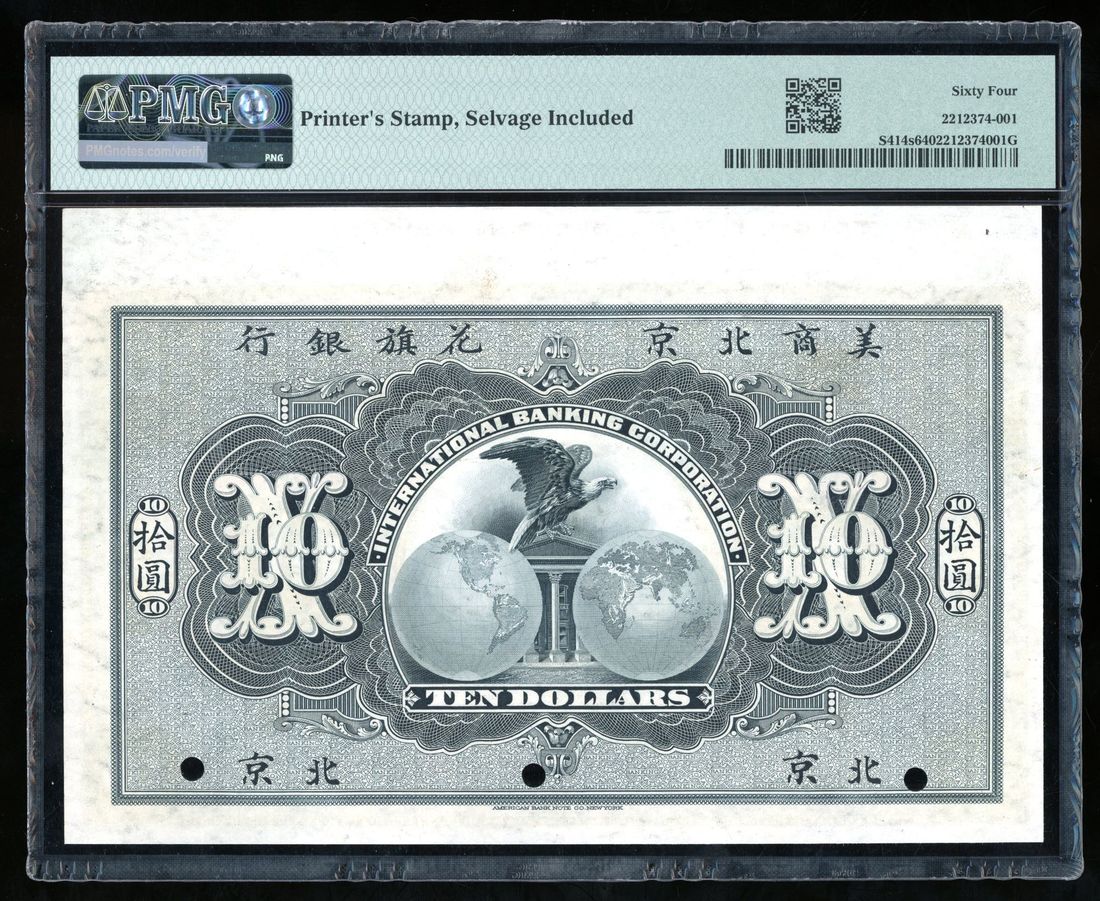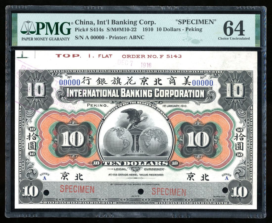 (x) International Banking Corporation, China, specimen $10, Peking, 1910, 5 digits serial number A00000, no printed signature,