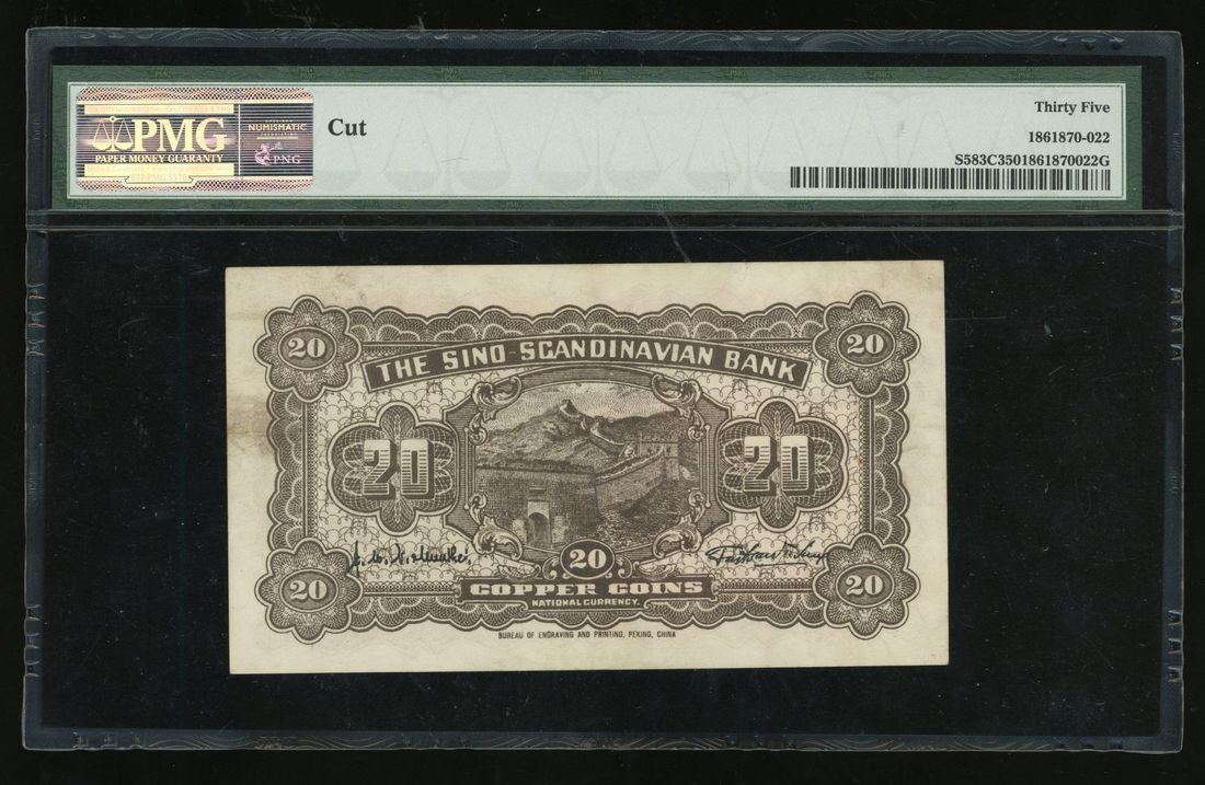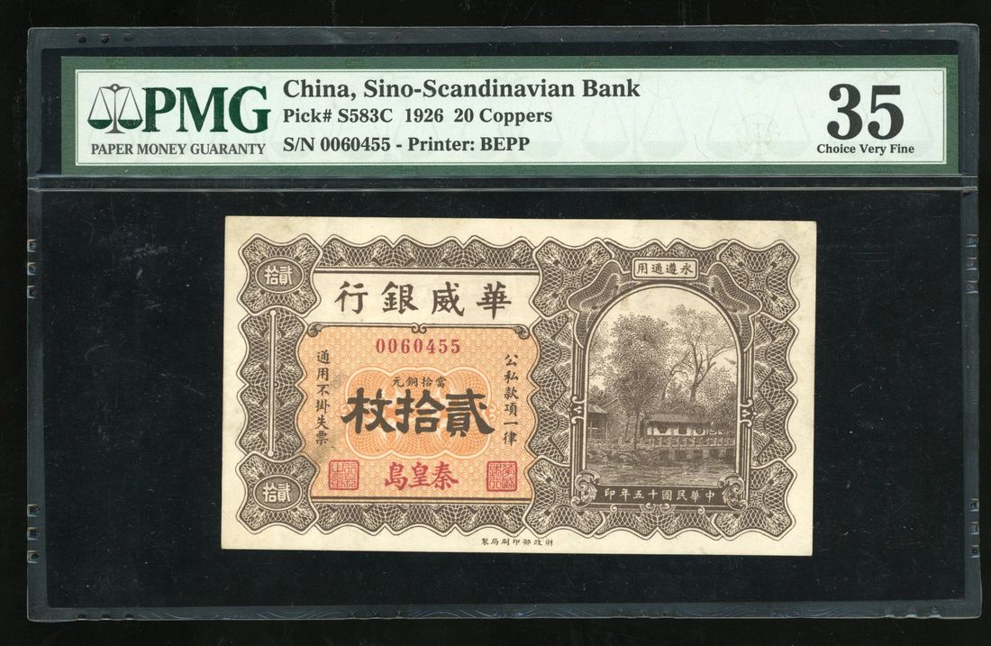 Sino-Scandinavian Bank, China, 20 coppers, Year 15 (1926), Chinwangtao, serial number 0060455, brown on orange, Summer Palace at left, brown on reverse, Great Wall at centre,