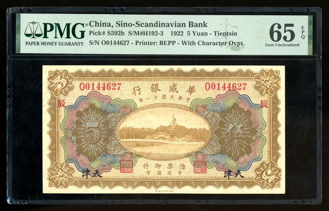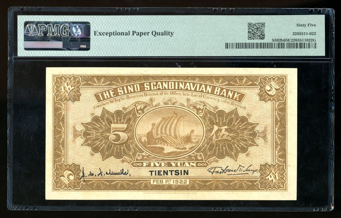 Sino-Scandinavian Bank, China, 5 yuan, Year 11 (1922), Tientsin, serial number O0144627, (Pick S592b), PMG 65EPQ