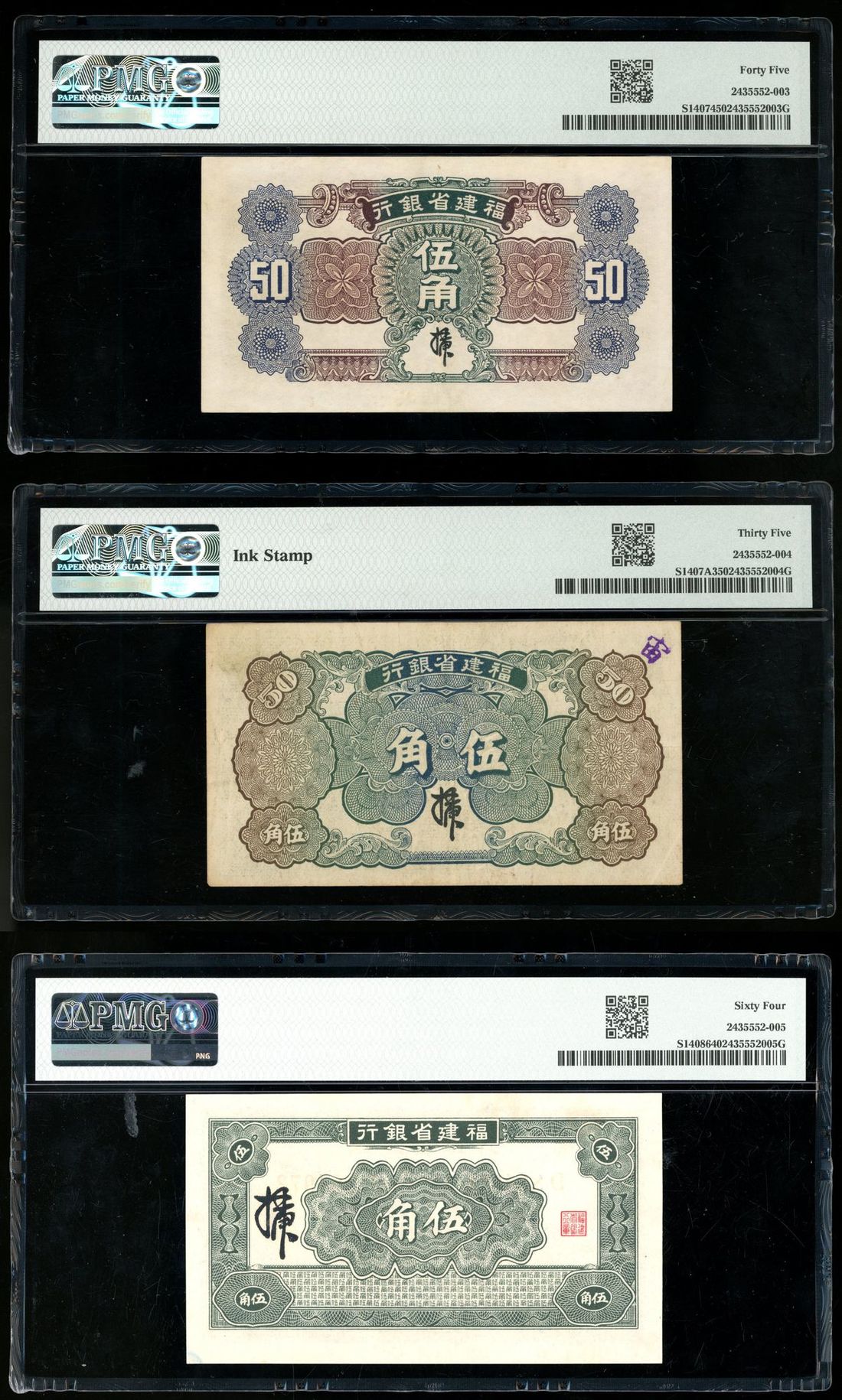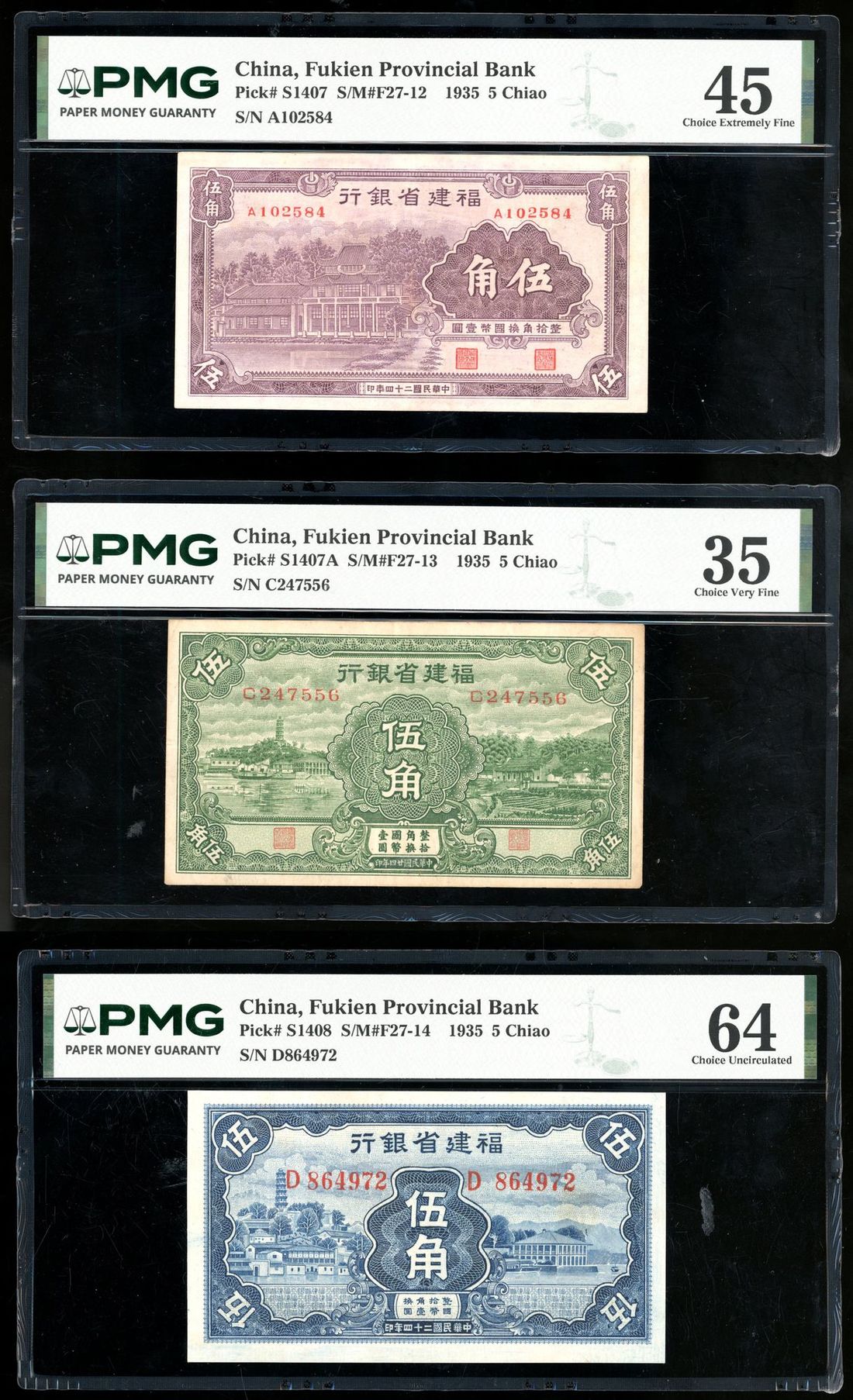 (x) Fukien Provincial Bank, China, 5 jiao (3), Year 24 (1935), purple, green and blue, all different types and designs,