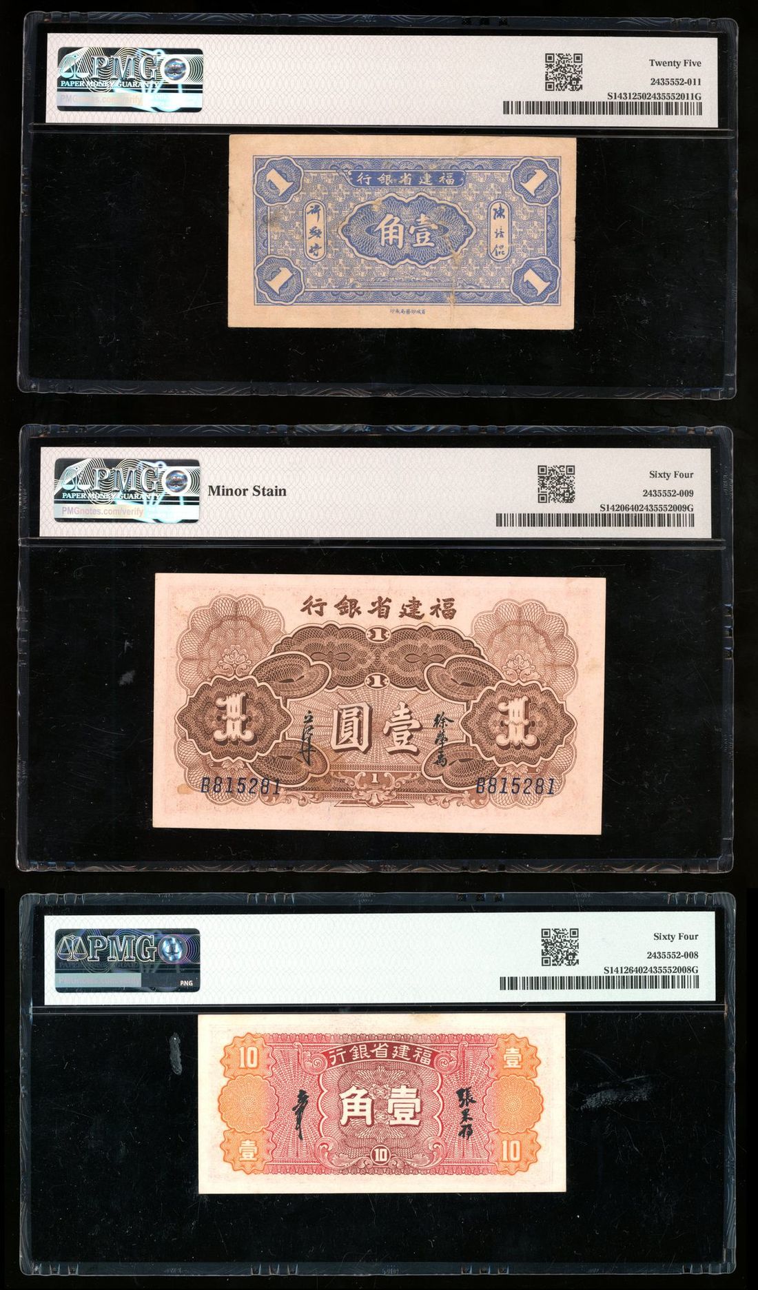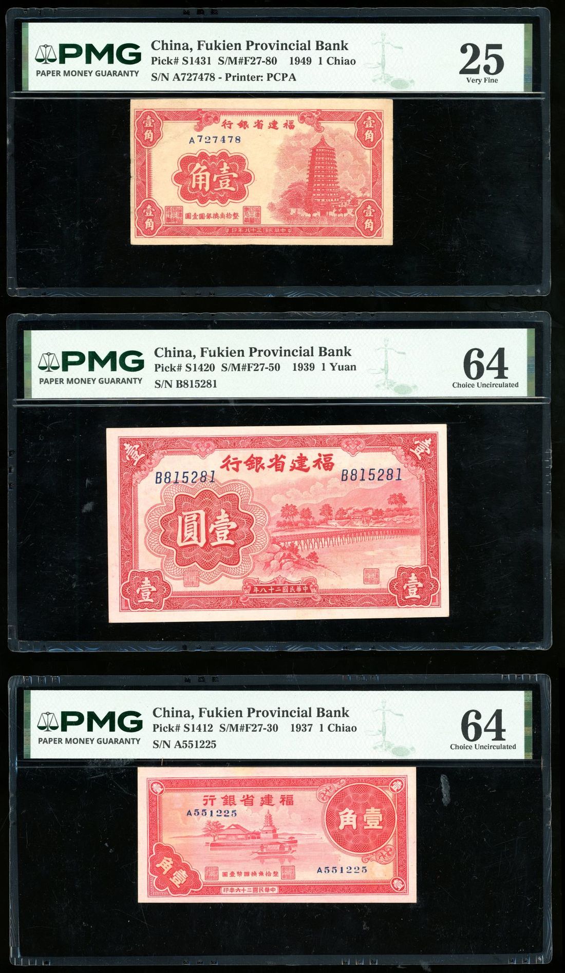 (x) Fukien Provincial Bank, China, a group of 3x, including 1 chiao 1937, 1 yuan 1939 and 1 chiao 1949, (Pick S1412, S1420, S1431), PMG 64, 64 (minor stain), 25 (3)