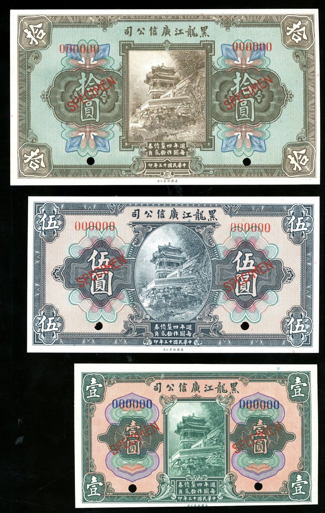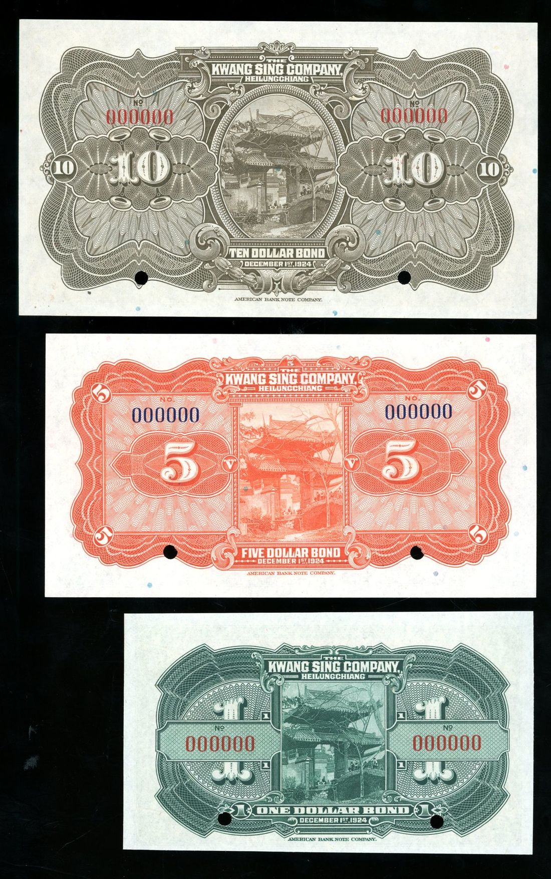 (x) Kwang Sing Company, China, a set of specimen 1, 5 and 10 dollar bond, Year 13 (1924), (Pick S1604s-S1606s), uncirculated