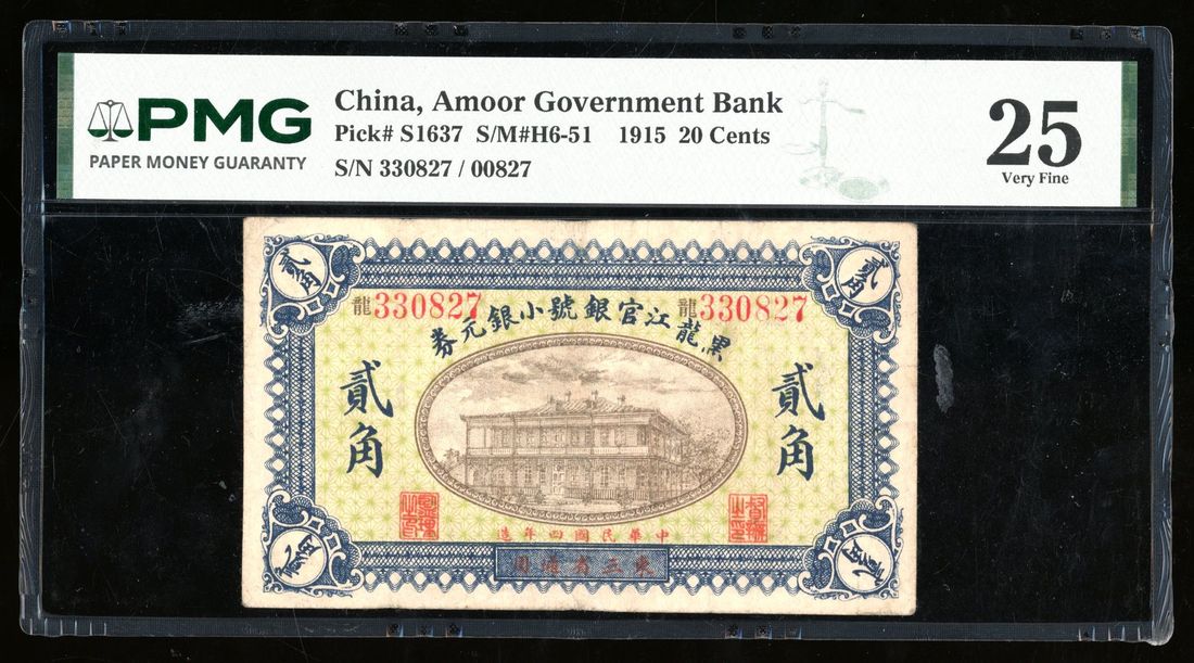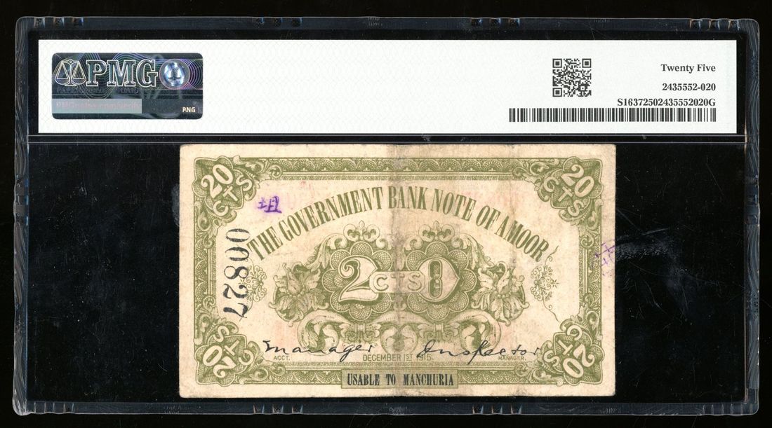 (x) Amoor Government Bank, China, 20 cents, Year 4 (1915), serial number 330827, (Pick S1637), PMG 25. PMG census one of three TOP POP. Quite rare