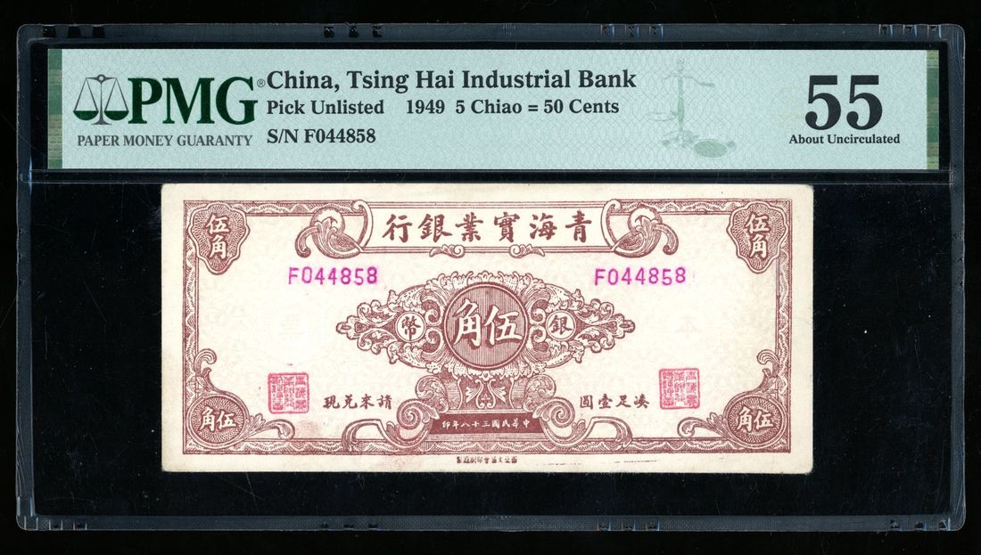 (x) Tsing Hai Industrial Bank, China, 5 jiao, Year 38 (1949), serial number F044858, uniface,