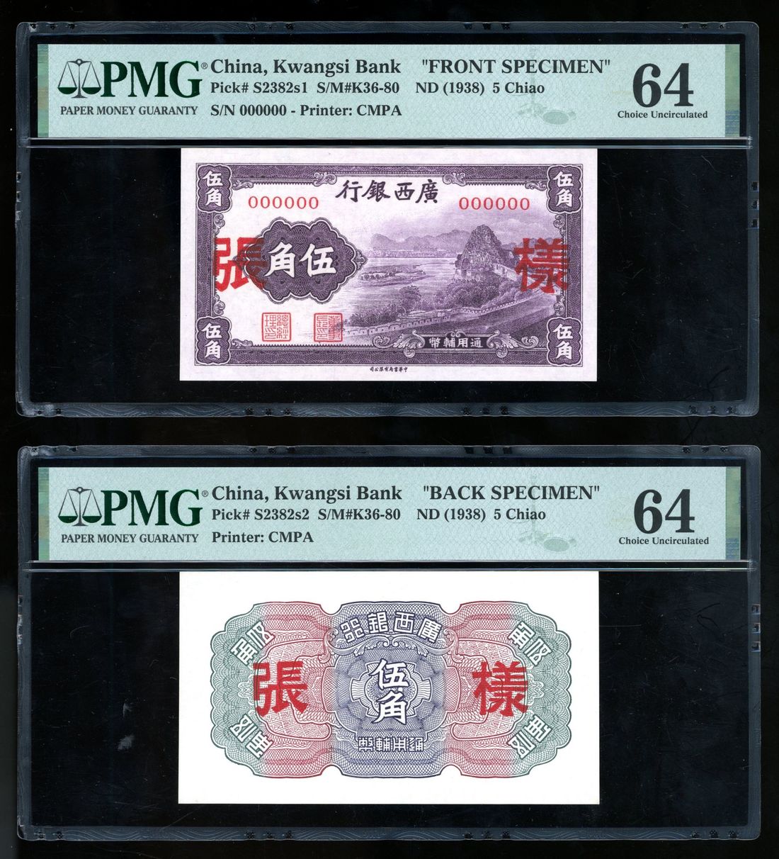 (x) Kwangsi Bank, China, obverse and reverse specimen 5 chiao, ND (1938), serial number 000000, uniface,