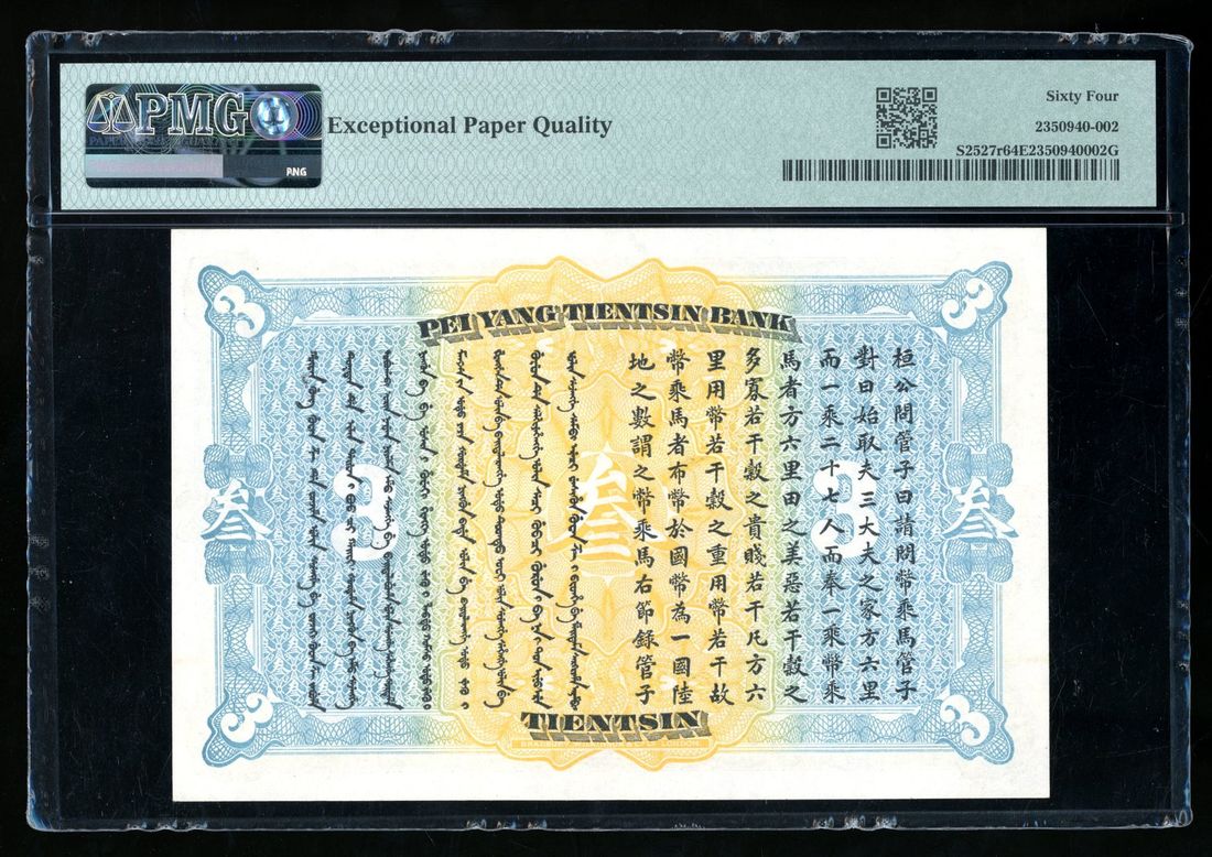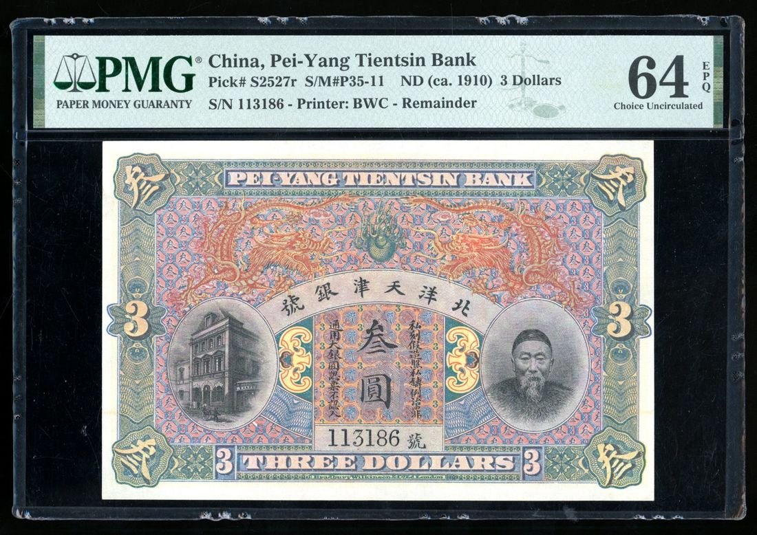 Pei-Yang Tientsin Bank, China, remainder 3 yuan, ca.1910, serial number 113186, (Pick S2727r), PMG 64EPQ. An iconic series that is always popular with collectors. Lovely example