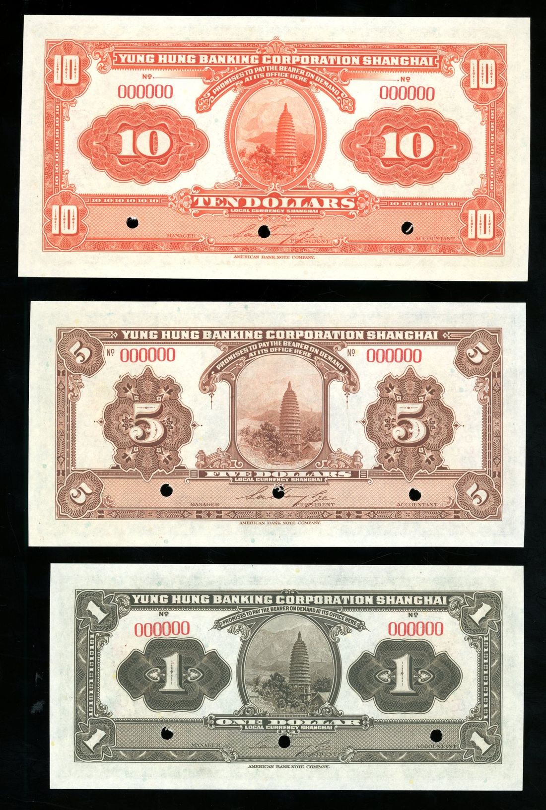 (x) Yung Hung Banking Corporation Shanghai, China, a set of Year 9 (1920), including 1, 5 and 10 yuan, punched, uncirculated. The bank was established in 1918 and was eventually absorbed under government management in 1952. This is the only set of banknotes produced by the bank. Rare (3)